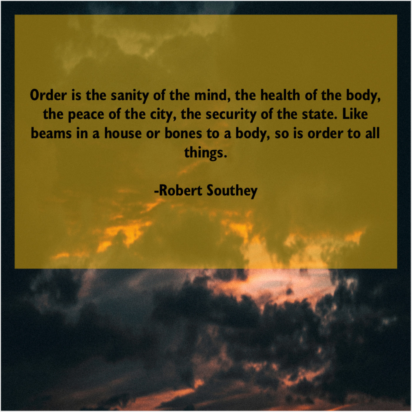 Robert Southey Robert Southey – Order is the sanity of… January 3, 2019 admin “Order is the sanity of the mind, the health of the body, the peace of the city, the security of the state. Like beams in a house or bones to a body, so is order to all things.”-Robert Southey