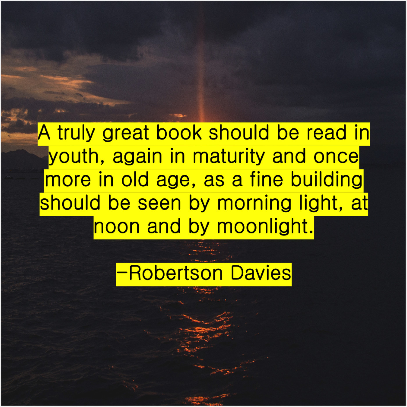 Robertson Davies Robertson Davies – A truly great book should… March 3, 2019 admin “A truly great book should be read in youth, again in maturity and once more in old age, as a fine building should be seen by morning light, at noon and by moonlight.”-Robertson Davies