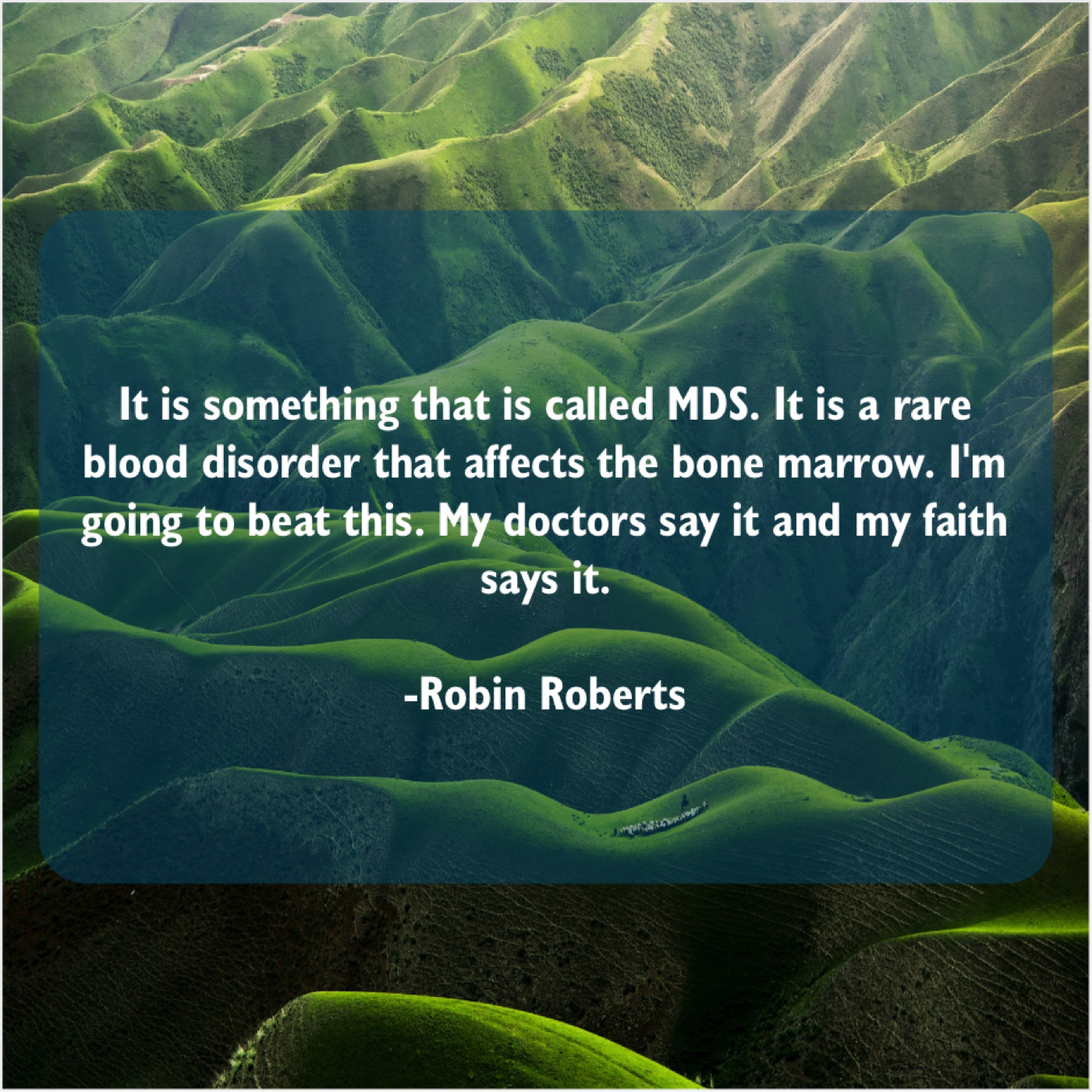 Robin Roberts Robin Roberts – It is something that is… March 23, 2019 admin “It is something that is called MDS. It is a rare blood disorder that affects the bone marrow. I’m going to beat this. My doctors say it and my faith says it.”-Robin Roberts