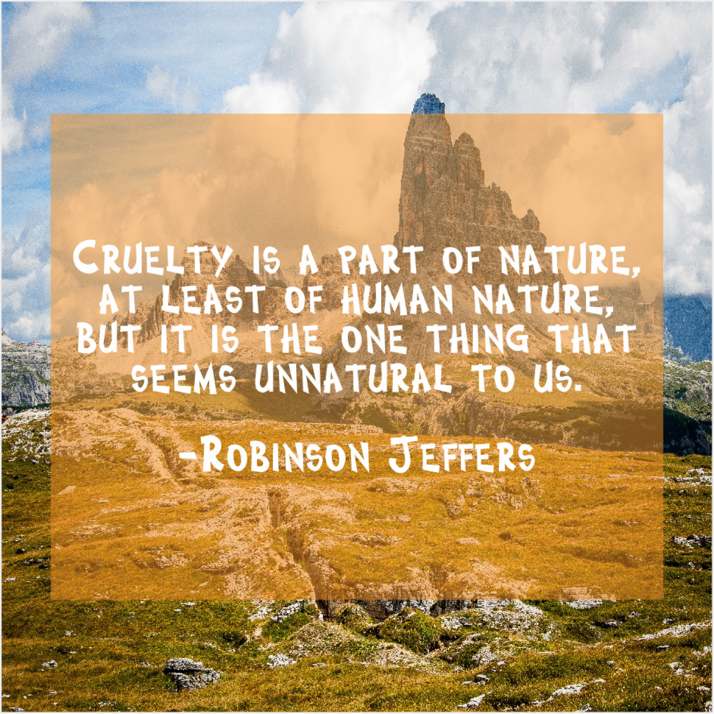 Robinson Jeffers Robinson Jeffers – Cruelty is a part of… October 16, 2019 admin “Cruelty is a part of nature, at least of human nature, but it is the one thing that seems unnatural to us.”-Robinson Jeffers