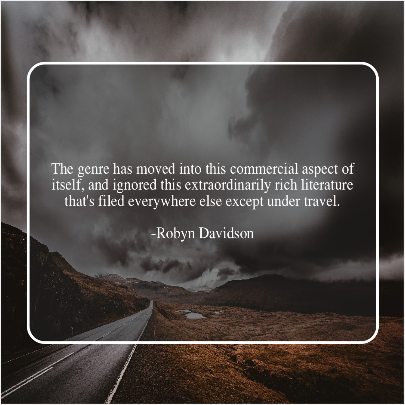 Robyn Davidson Robyn Davidson – The genre has moved into… September 24, 2019 admin “The genre has moved into this commercial aspect of itself, and ignored this extraordinarily rich literature that’s filed everywhere else except under travel.”-Robyn Davidson