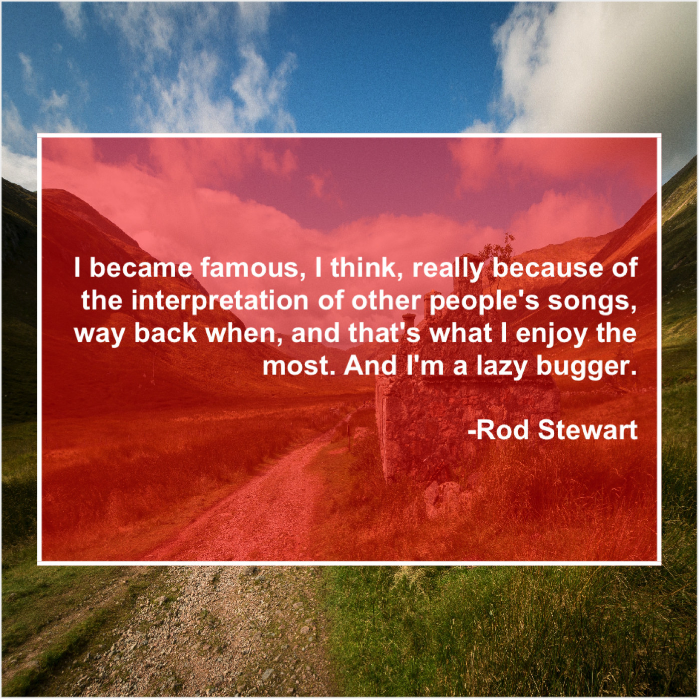 Rod Stewart Rod Stewart – I became famous, I think… February 7, 2019 admin “I became famous, I think, really because of the interpretation of other people’s songs, way back when, and that’s what I enjoy the most. And I’m a lazy bugger.”-Rod Stewart