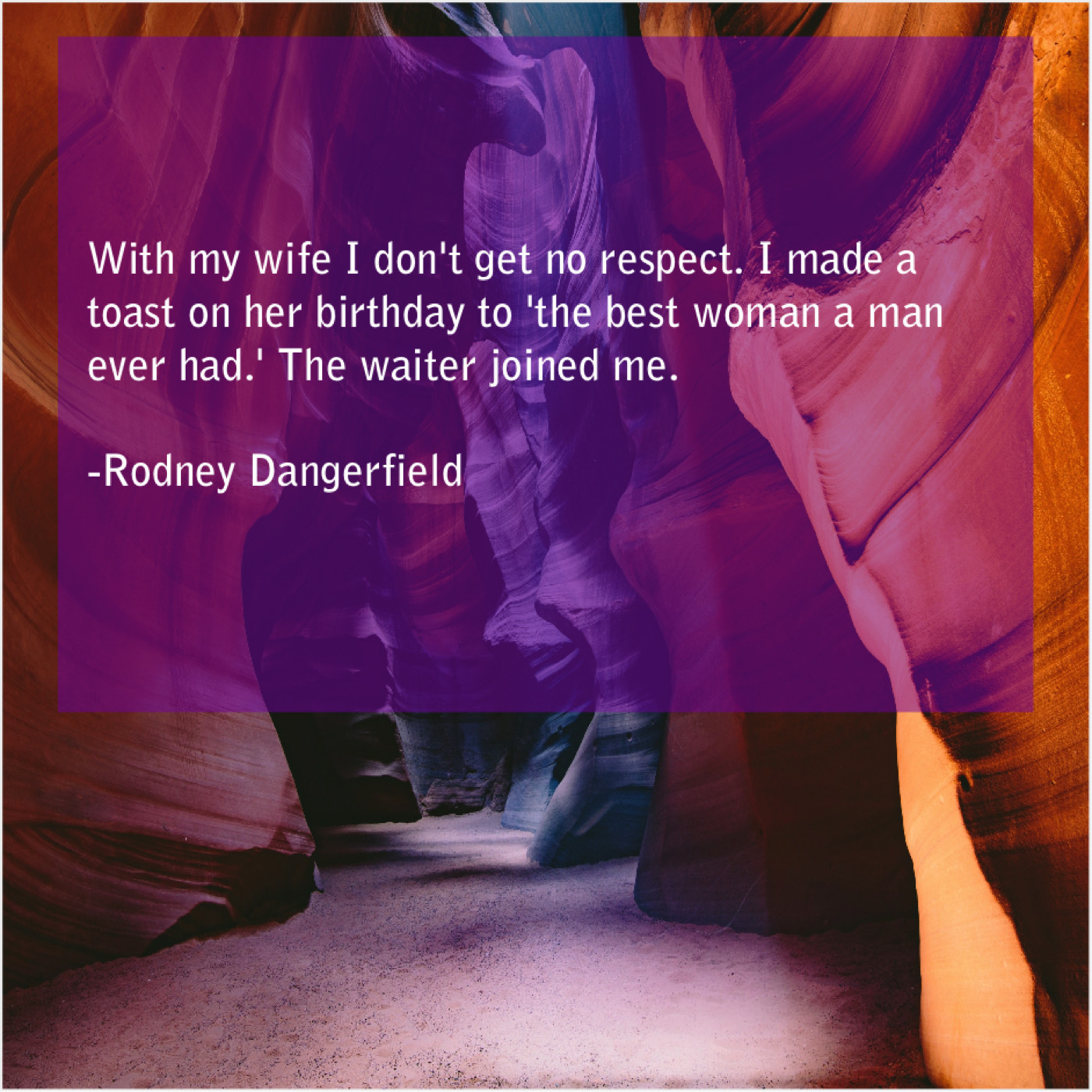 Rodney Dangerfield Rodney Dangerfield – With my wife I don’t… April 22, 2019 admin “With my wife I don’t get no respect. I made a toast on her birthday to ‘the best woman a man ever had.’ The waiter joined me.”-Rodney Dangerfield