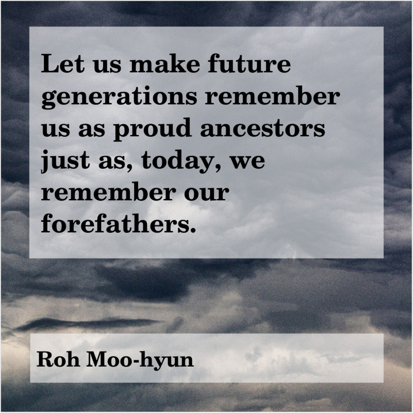 Roh Moo-hyun Roh Moo-hyun – Let us make future generations… September 15, 2019 admin “Let us make future generations remember us as proud ancestors just as, today, we remember our forefathers.”-Roh Moo-hyun