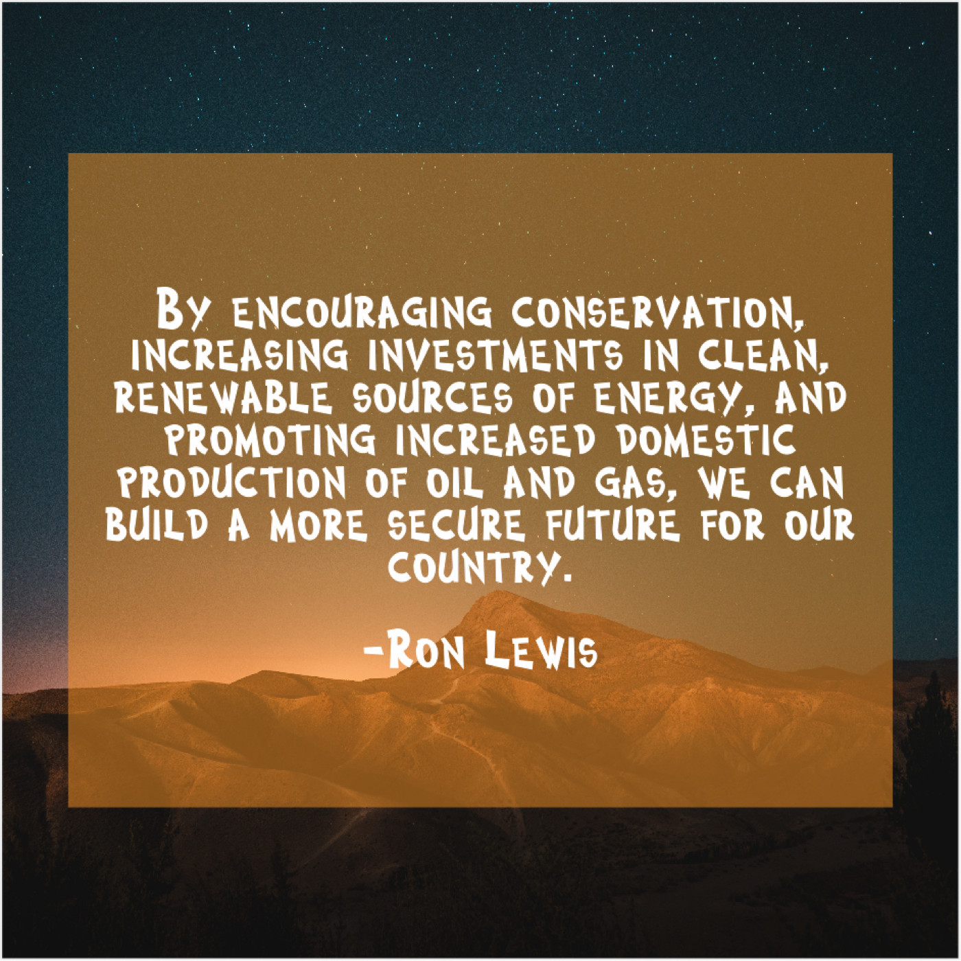 Ron Lewis Ron Lewis – By encouraging conservation, increasing investments… November 10, 2018 admin “By encouraging conservation, increasing investments in clean, renewable sources of energy, and promoting increased domestic production of oil and gas, we can build a more secure future for our country.”-Ron Lewis