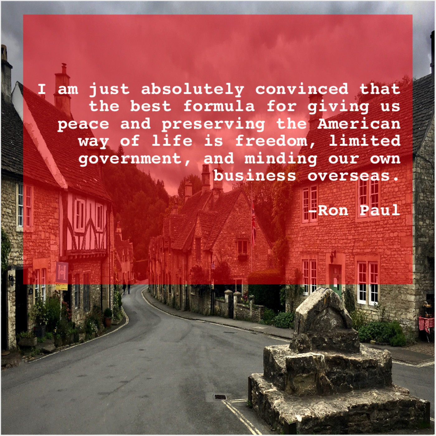 Ron Paul Ron Paul – I am just absolutely convinced… November 10, 2018 admin “I am just absolutely convinced that the best formula for giving us peace and preserving the American way of life is freedom, limited government, and minding our own business overseas.”-Ron Paul