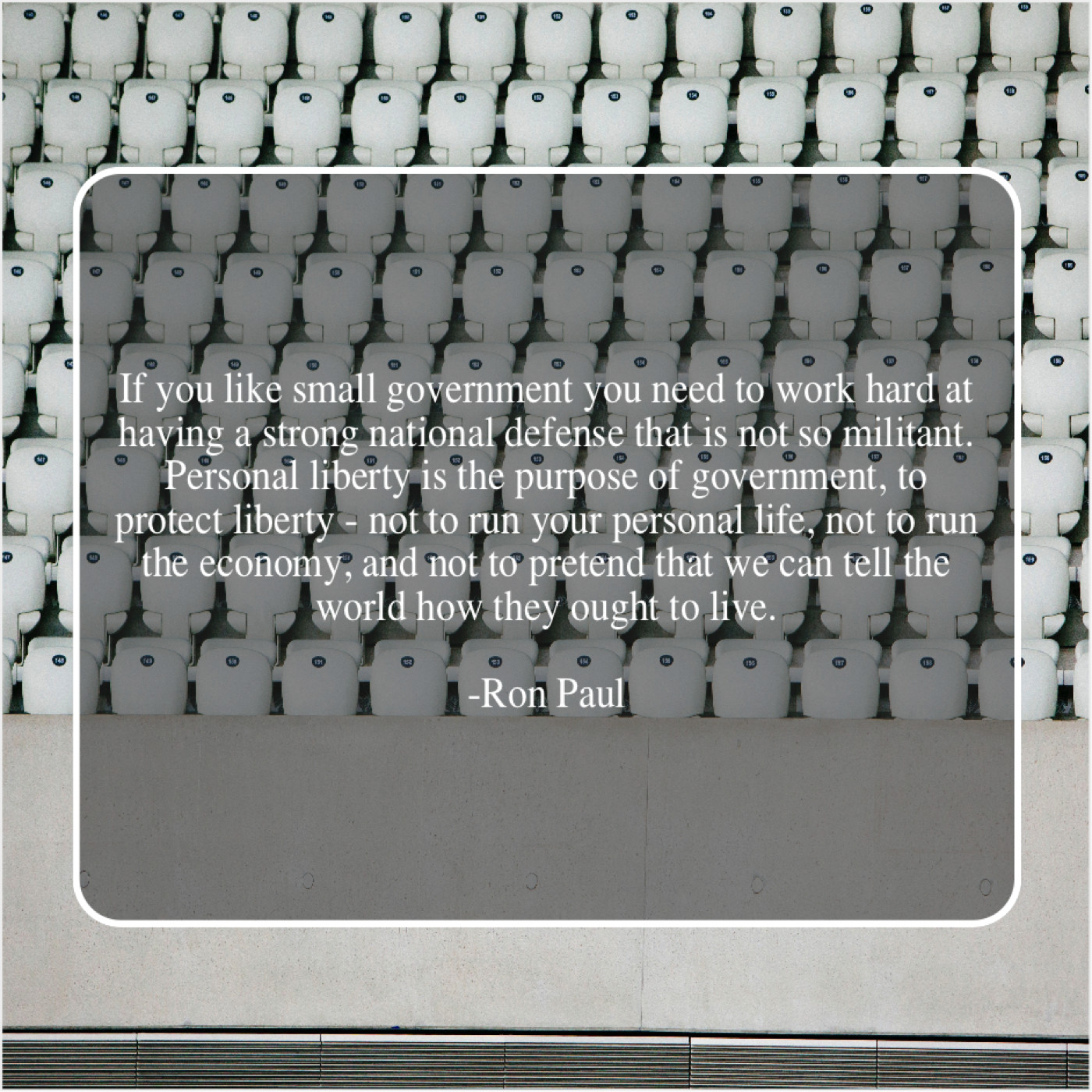 “If you like small government you need to work hard at having a strong national defense that is not so militant. Personal liberty is the purpose of government, to protect liberty – not to run your personal life, not to run the economy, and not to pretend that we can tell the world how they ought to live.”
