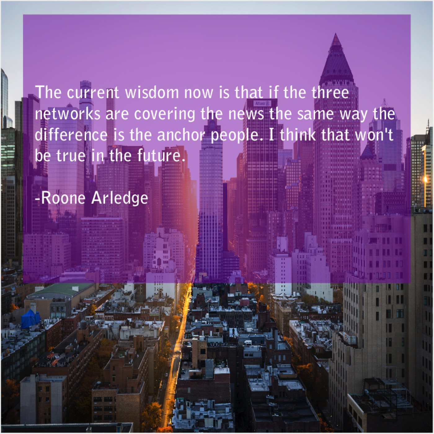 Roone Arledge Roone Arledge – The current wisdom now is… March 24, 2019 admin “The current wisdom now is that if the three networks are covering the news the same way the difference is the anchor people. I think that won’t be true in the future.”-Roone Arledge