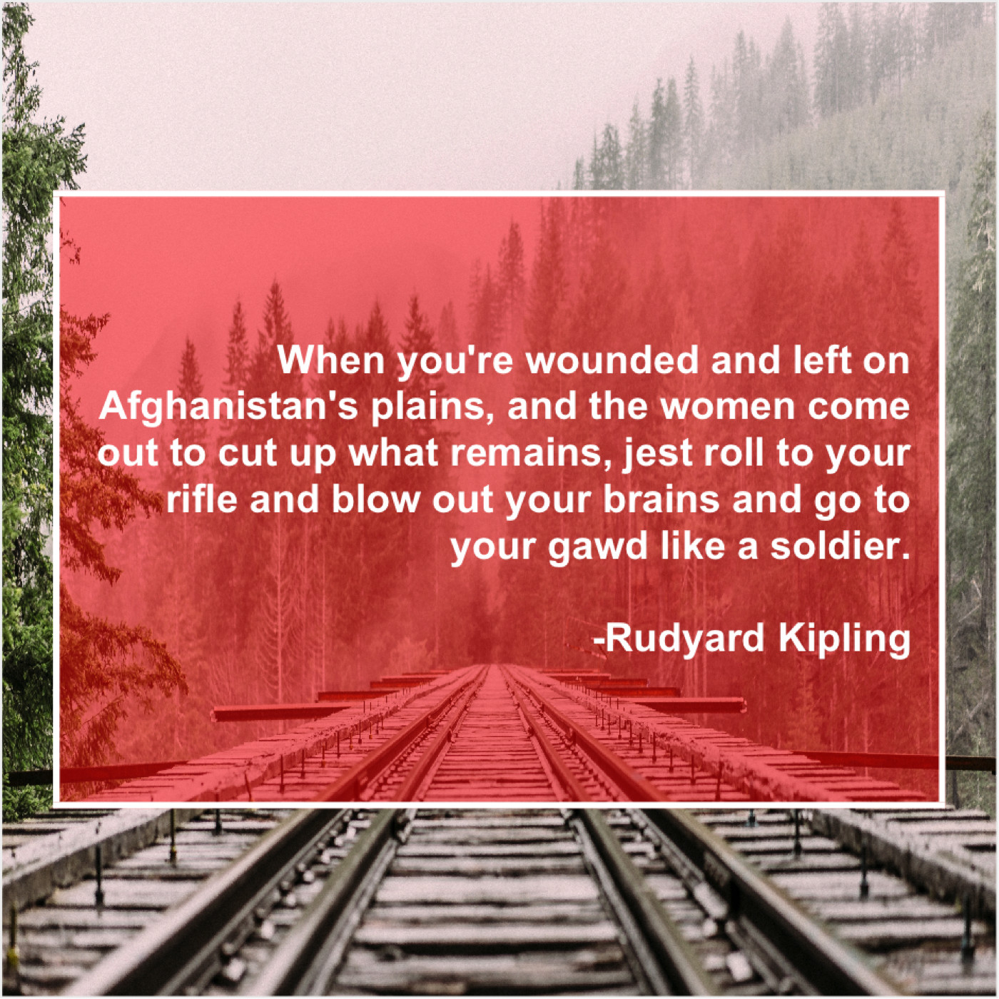 Rudyard Kipling Rudyard Kipling – When you’re wounded and left… March 6, 2019 admin “When you’re wounded and left on Afghanistan’s plains, and the women come out to cut up what remains, jest roll to your rifle and blow out your brains and go to your gawd like a soldier.”-Rudyard Kipling