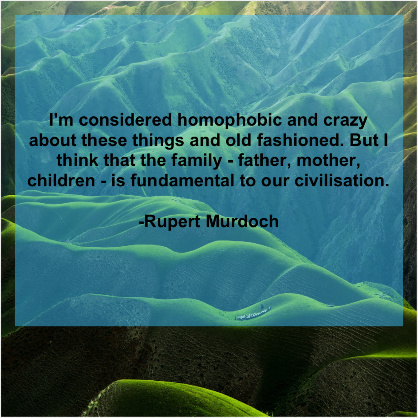 Rupert Murdoch Rupert Murdoch – I’m considered homophobic and crazy… July 12, 2019 admin “I’m considered homophobic and crazy about these things and old fashioned. But I think that the family – father, mother, children – is fundamental to our civilisation.”-Rupert Murdoch