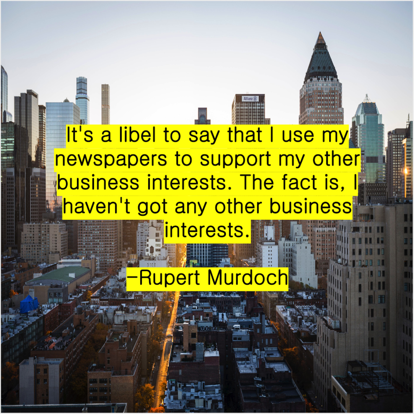 Rupert Murdoch Rupert Murdoch – It’s a libel to say… October 18, 2019 admin “It’s a libel to say that I use my newspapers to support my other business interests. The fact is, I haven’t got any other business interests.”-Rupert Murdoch