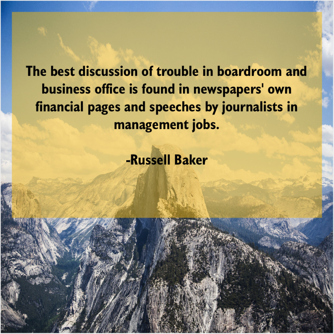 Russell Baker Russell Baker – The best discussion of trouble… April 15, 2019 admin “The best discussion of trouble in boardroom and business office is found in newspapers’ own financial pages and speeches by journalists in management jobs.”-Russell Baker