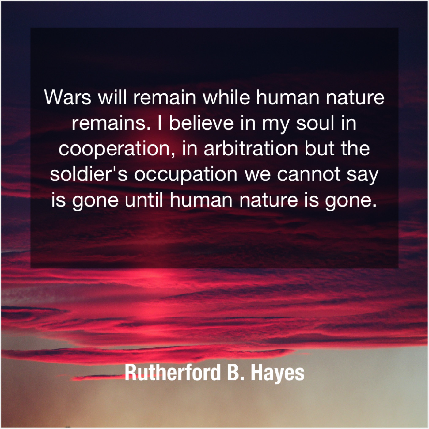 Rutherford B. Hayes Rutherford B. Hayes – Wars will remain while human… August 16, 2019 admin “Wars will remain while human nature remains. I believe in my soul in cooperation, in arbitration but the soldier’s occupation we cannot say is gone until human nature is gone.”-Rutherford B. Hayes