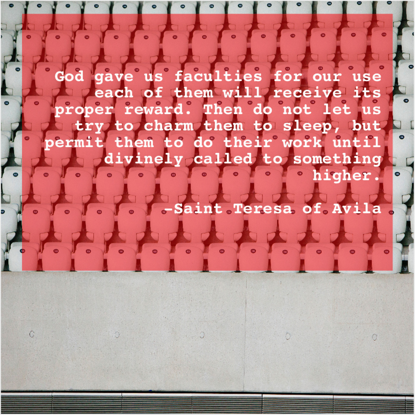 Saint Teresa of Avila Saint Teresa of Avila – God gave us faculties for… January 17, 2019 admin “God gave us faculties for our use each of them will receive its proper reward. Then do not let us try to charm them to sleep, but permit them to do their work until divinely called to something higher.”-Saint Teresa of Avila