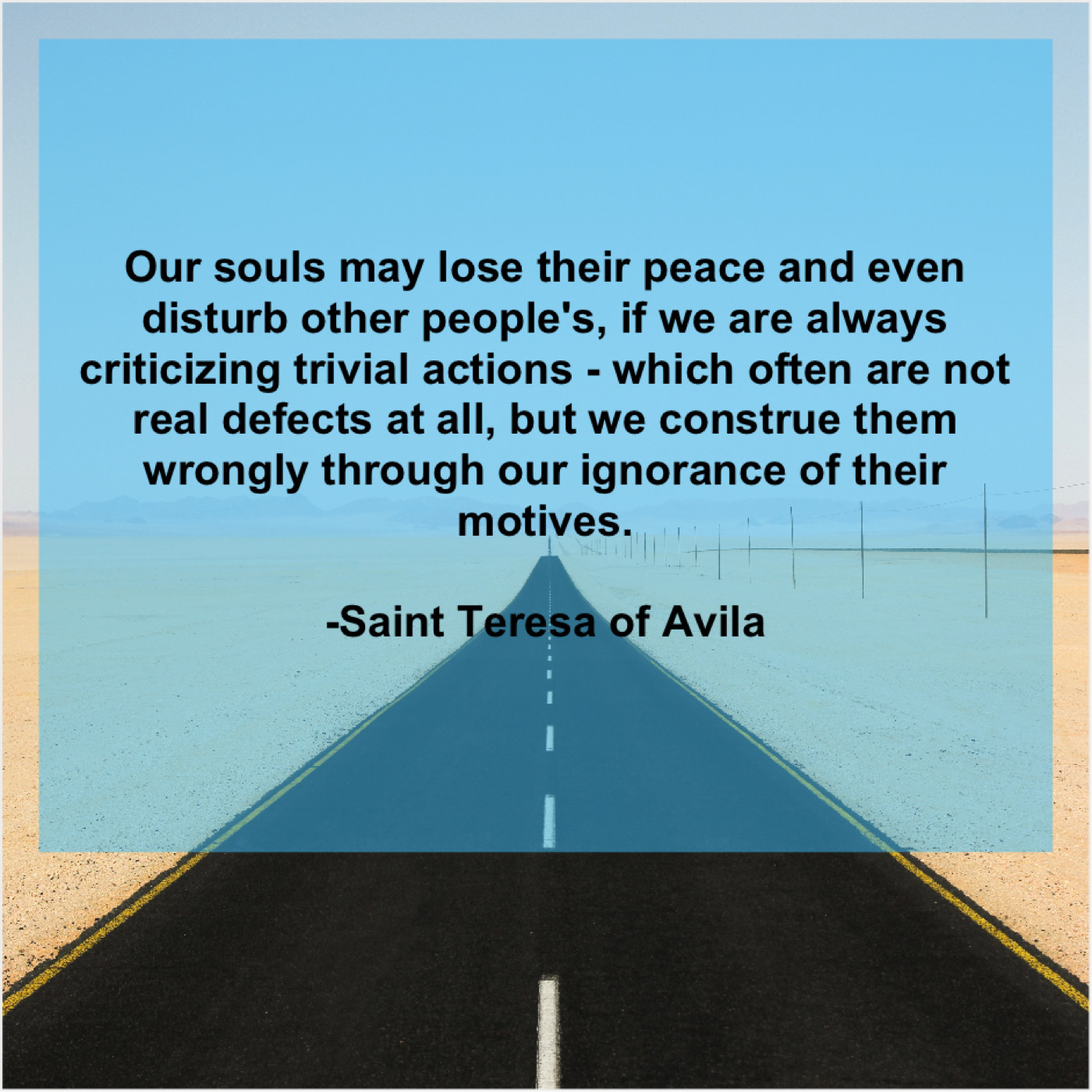 Saint Teresa of Avila Saint Teresa of Avila – Our souls may lose their… December 13, 2018 admin “Our souls may lose their peace and even disturb other people’s, if we are always criticizing trivial actions – which often are not real defects at all, but we construe them wrongly through our ignorance of their motives.”-Saint Teresa of Avila