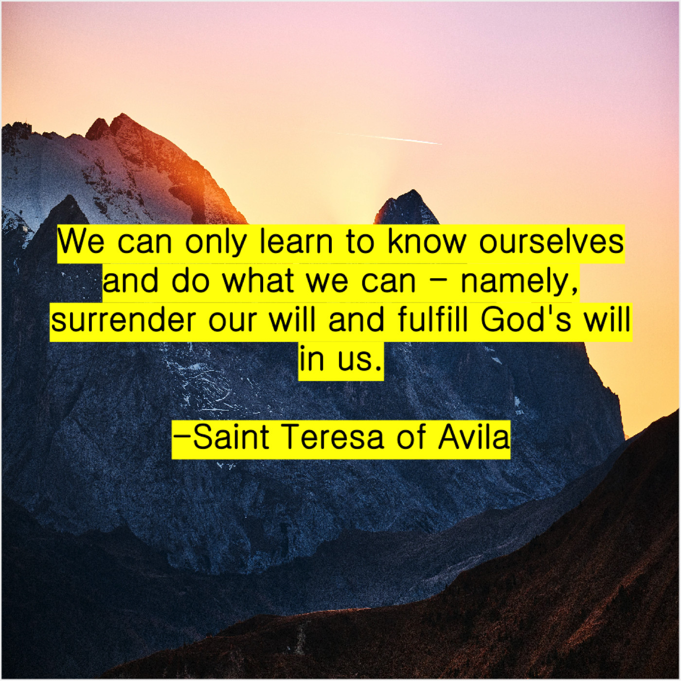 Saint Teresa of Avila Saint Teresa of Avila – We can only learn to… July 16, 2019 admin “We can only learn to know ourselves and do what we can – namely, surrender our will and fulfill God’s will in us.”-Saint Teresa of Avila