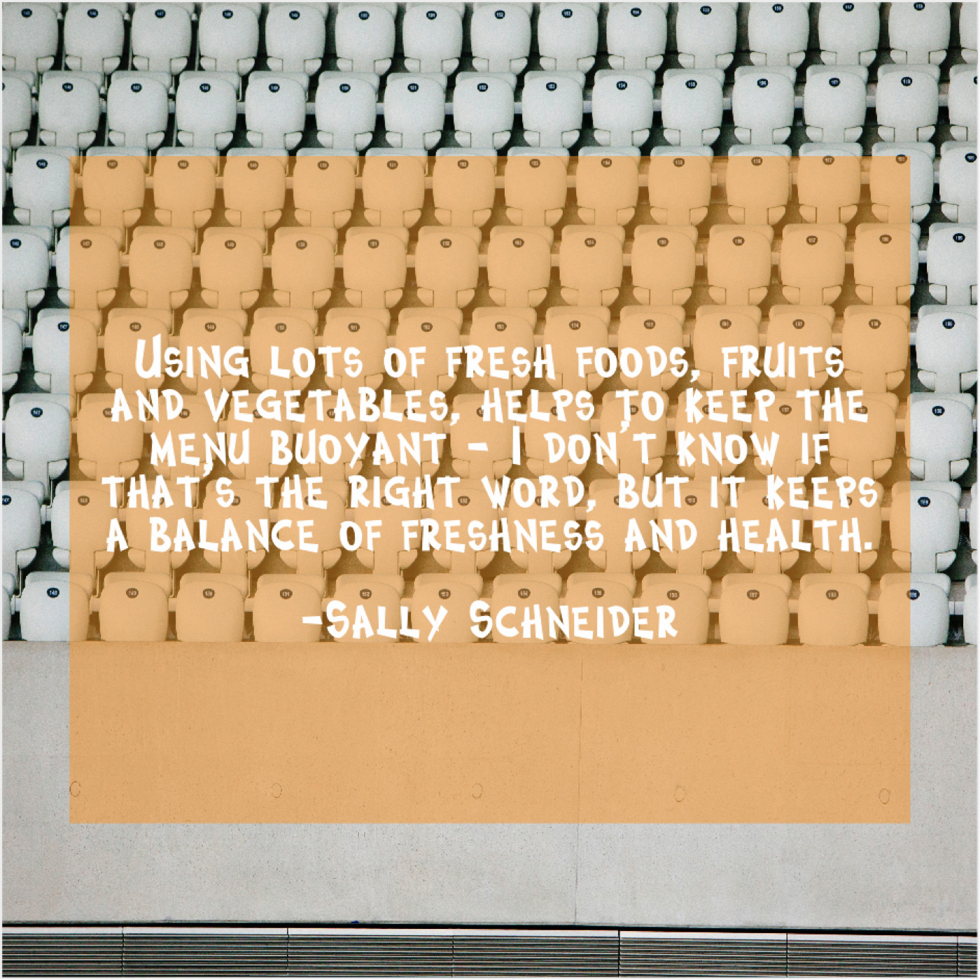 Sally Schneider Sally Schneider – Using lots of fresh foods… September 7, 2019 admin “Using lots of fresh foods, fruits and vegetables, helps to keep the menu buoyant – I don’t know if that’s the right word, but it keeps a balance of freshness and health.”-Sally Schneider