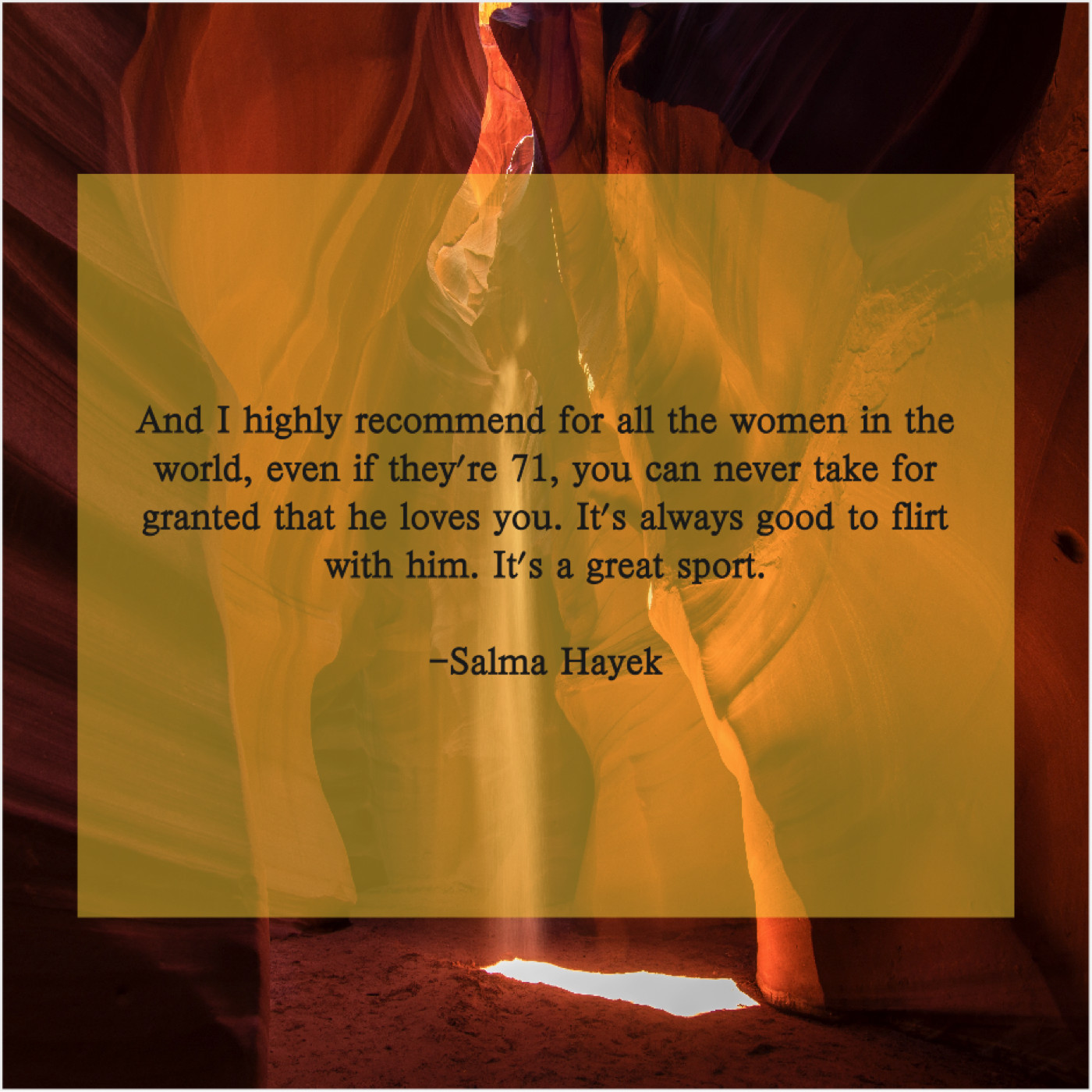 Salma Hayek Salma Hayek – And I highly recommend for… June 19, 2019 admin “And I highly recommend for all the women in the world, even if they’re 71, you can never take for granted that he loves you. It’s always good to flirt with him. It’s a great sport.”-Salma Hayek