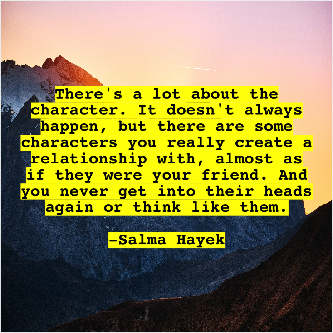 Salma Hayek Salma Hayek – There’s a lot about the… August 12, 2019 admin “There’s a lot about the character. It doesn’t always happen, but there are some characters you really create a relationship with, almost as if they were your friend. And you never get into their heads again or think like them.”-Salma Hayek