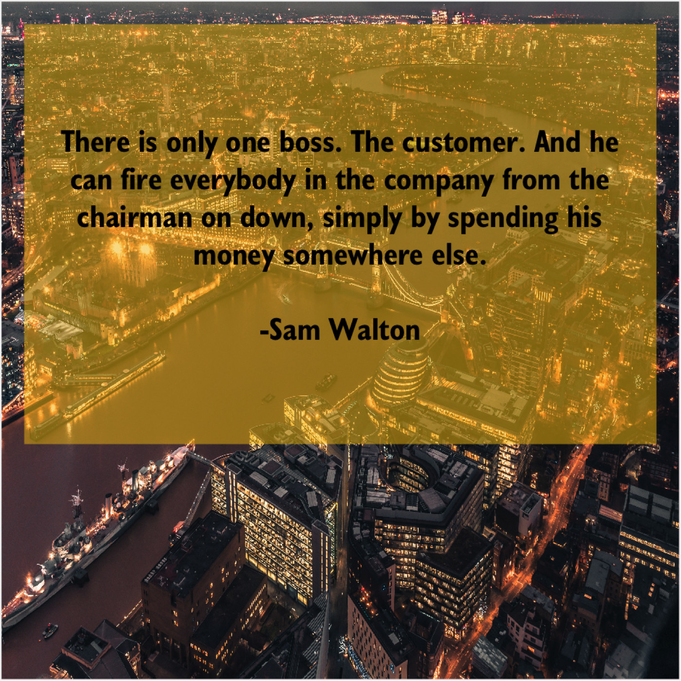 Sam Walton Sam Walton – There is only one boss… February 11, 2019 admin “There is only one boss. The customer. And he can fire everybody in the company from the chairman on down, simply by spending his money somewhere else.”-Sam Walton