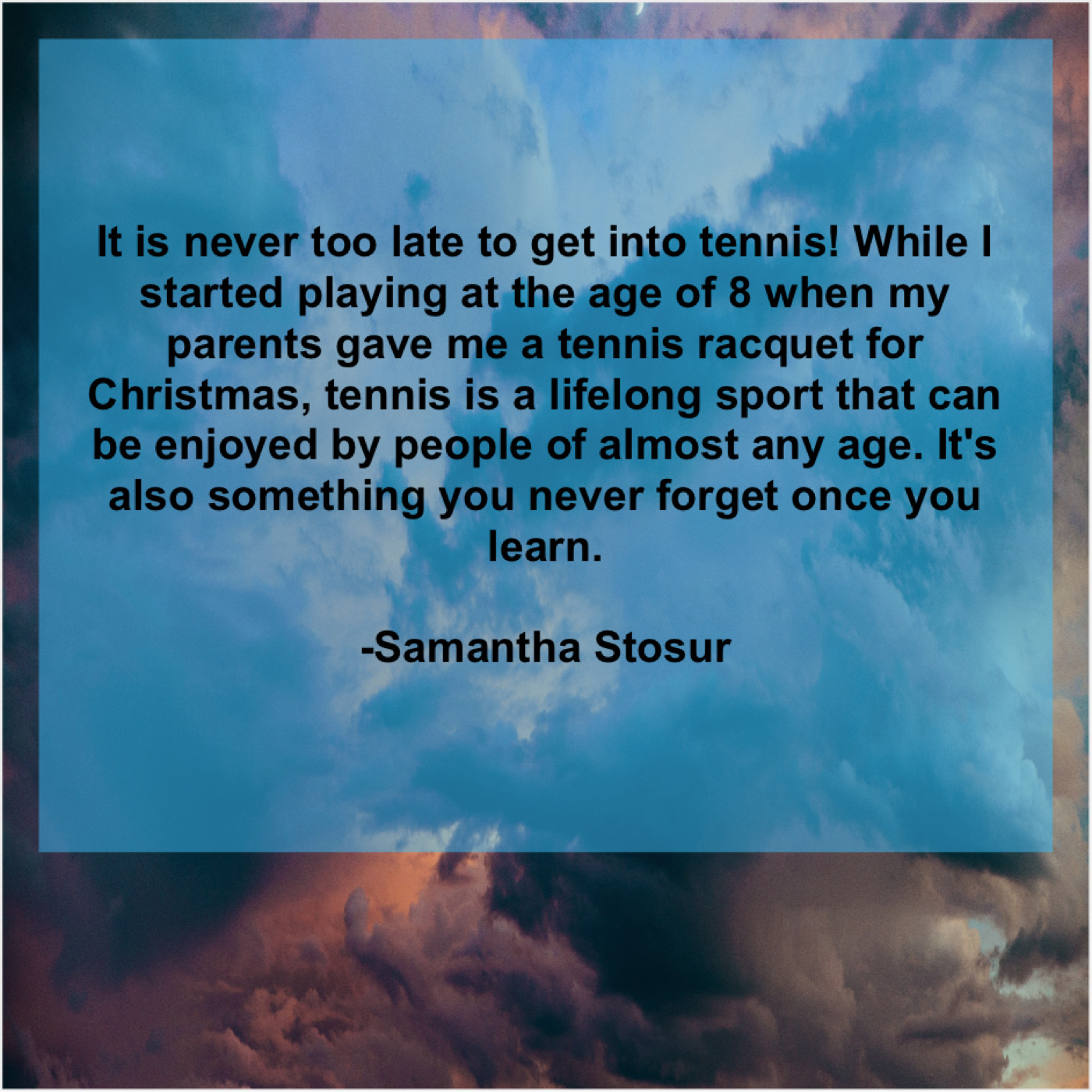 “It is never too late to get into tennis! While I started playing at the age of 8 when my parents gave me a tennis racquet for Christmas, tennis is a lifelong sport that can be enjoyed by people of almost any age. It’s also something you never forget once you learn.”