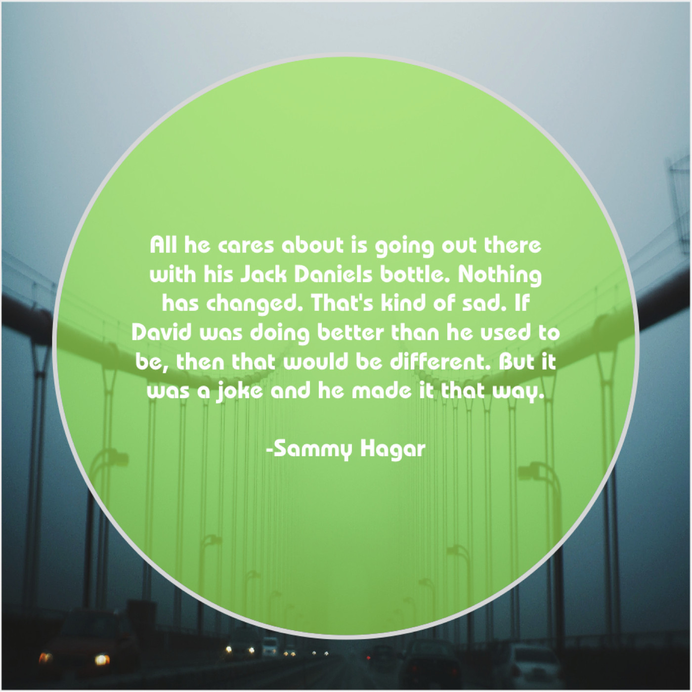 Sammy Hagar Sammy Hagar – All he cares about is… May 16, 2019 admin “All he cares about is going out there with his Jack Daniels bottle. Nothing has changed. That’s kind of sad. If David was doing better than he used to be, then that would be different. But it was a joke and he made it that way.”-Sammy Hagar