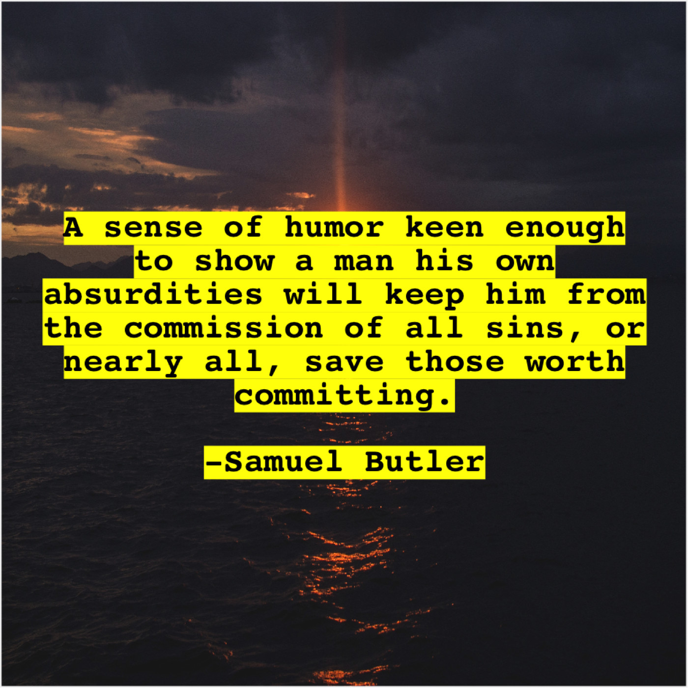 Samuel Butler Samuel Butler – A sense of humor keen… August 1, 2019 admin “A sense of humor keen enough to show a man his own absurdities will keep him from the commission of all sins, or nearly all, save those worth committing.”-Samuel Butler