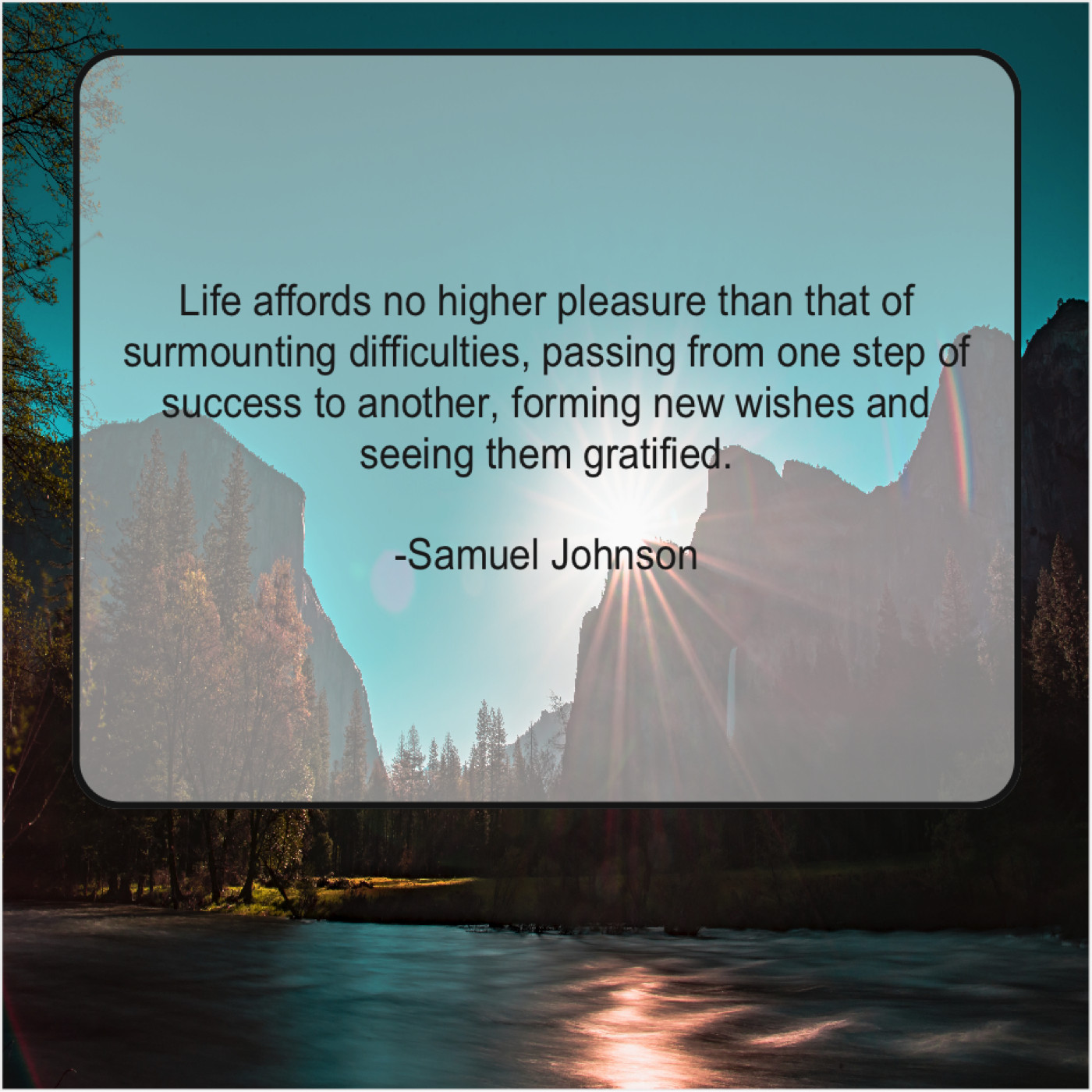 Samuel Johnson Samuel Johnson – Life affords no higher pleasure… August 3, 2019 admin “Life affords no higher pleasure than that of surmounting difficulties, passing from one step of success to another, forming new wishes and seeing them gratified.”-Samuel Johnson