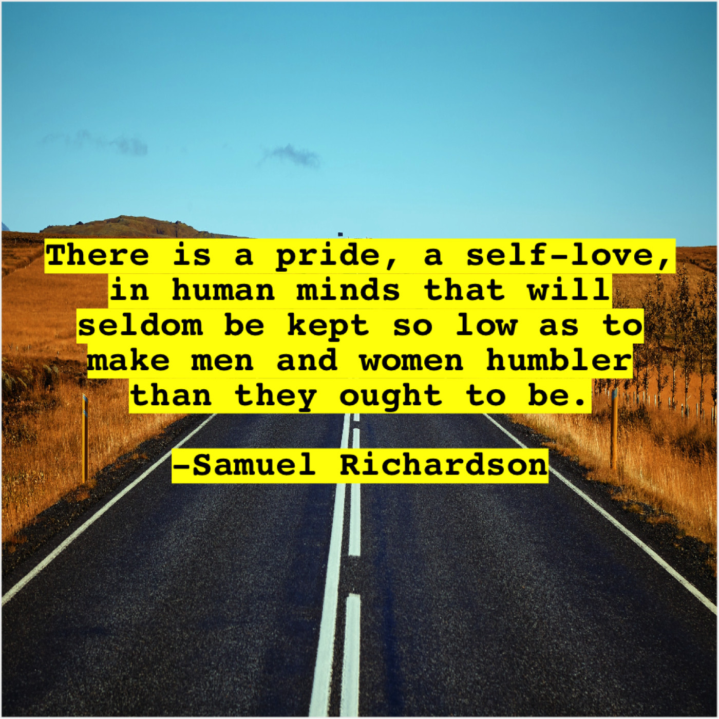 Samuel Richardson Samuel Richardson – There is a pride, a… February 16, 2019 admin “There is a pride, a self-love, in human minds that will seldom be kept so low as to make men and women humbler than they ought to be.”-Samuel Richardson