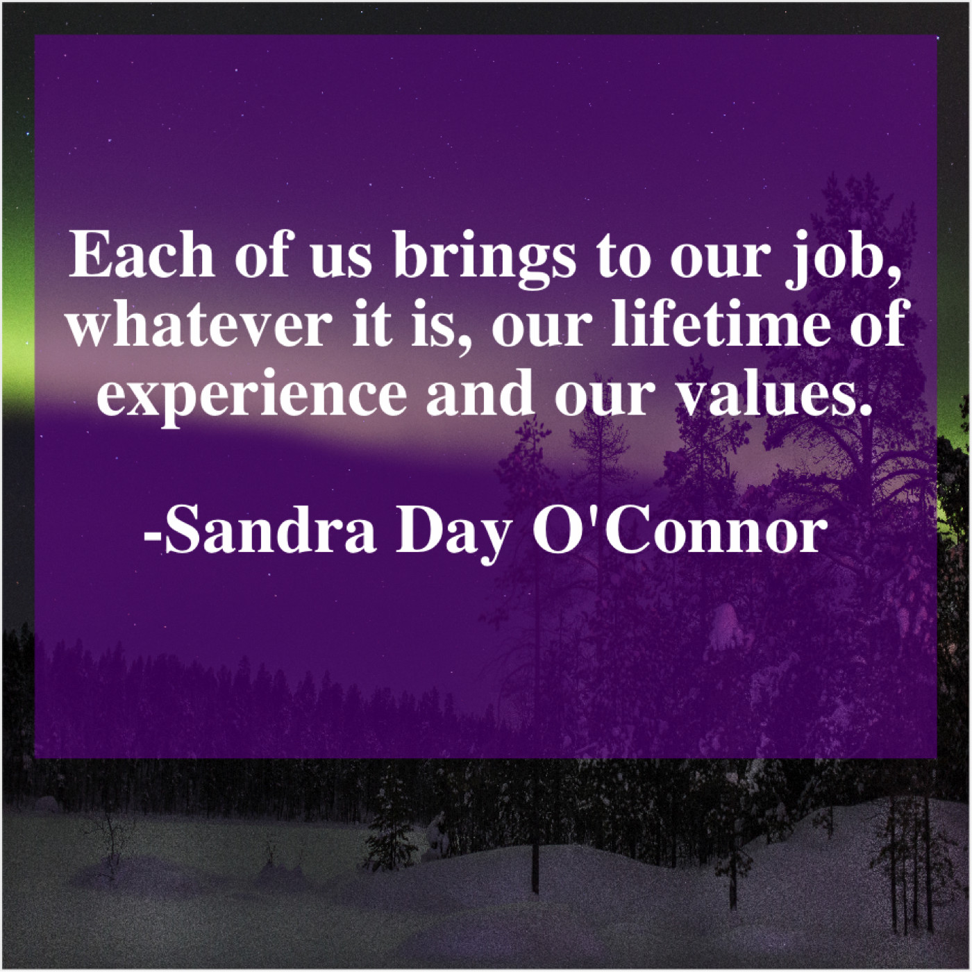 Sandra Day O'Connor Sandra Day O’Connor – Each of us brings to… August 26, 2019 admin “Each of us brings to our job, whatever it is, our lifetime of experience and our values.”-Sandra Day O’Connor