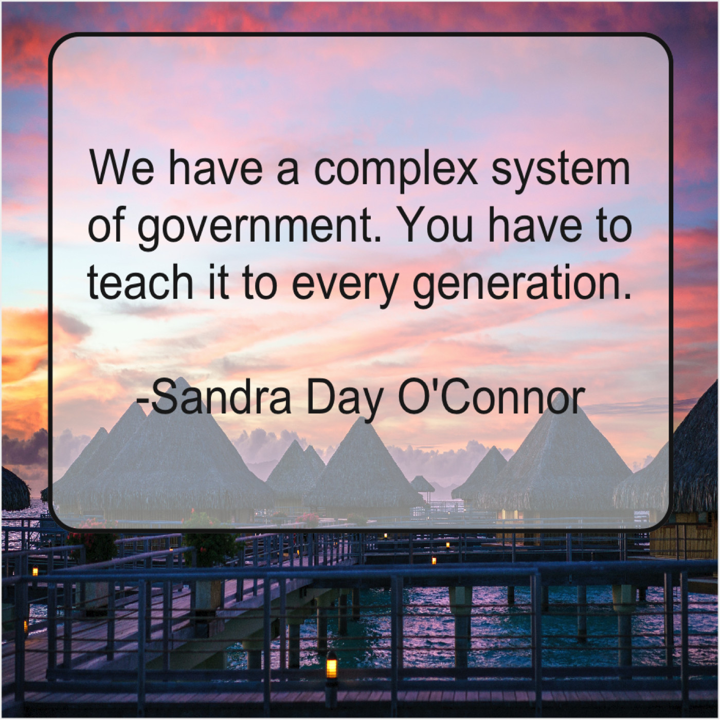 Sandra Day O'Connor Sandra Day O’Connor – We have a complex system… August 8, 2019 admin “We have a complex system of government. You have to teach it to every generation.”-Sandra Day O’Connor