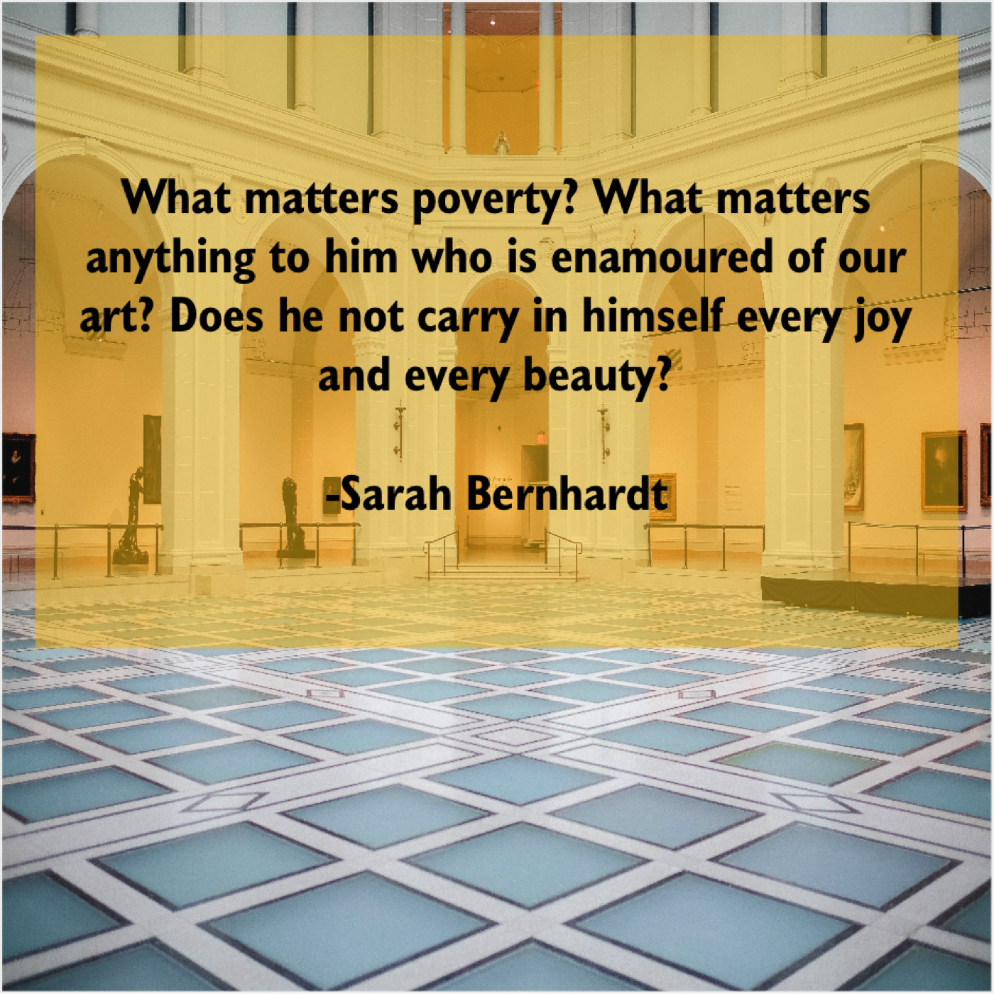 Sarah Bernhardt Sarah Bernhardt – What matters poverty? What matters… November 12, 2018 admin “What matters poverty? What matters anything to him who is enamoured of our art? Does he not carry in himself every joy and every beauty?”-Sarah Bernhardt