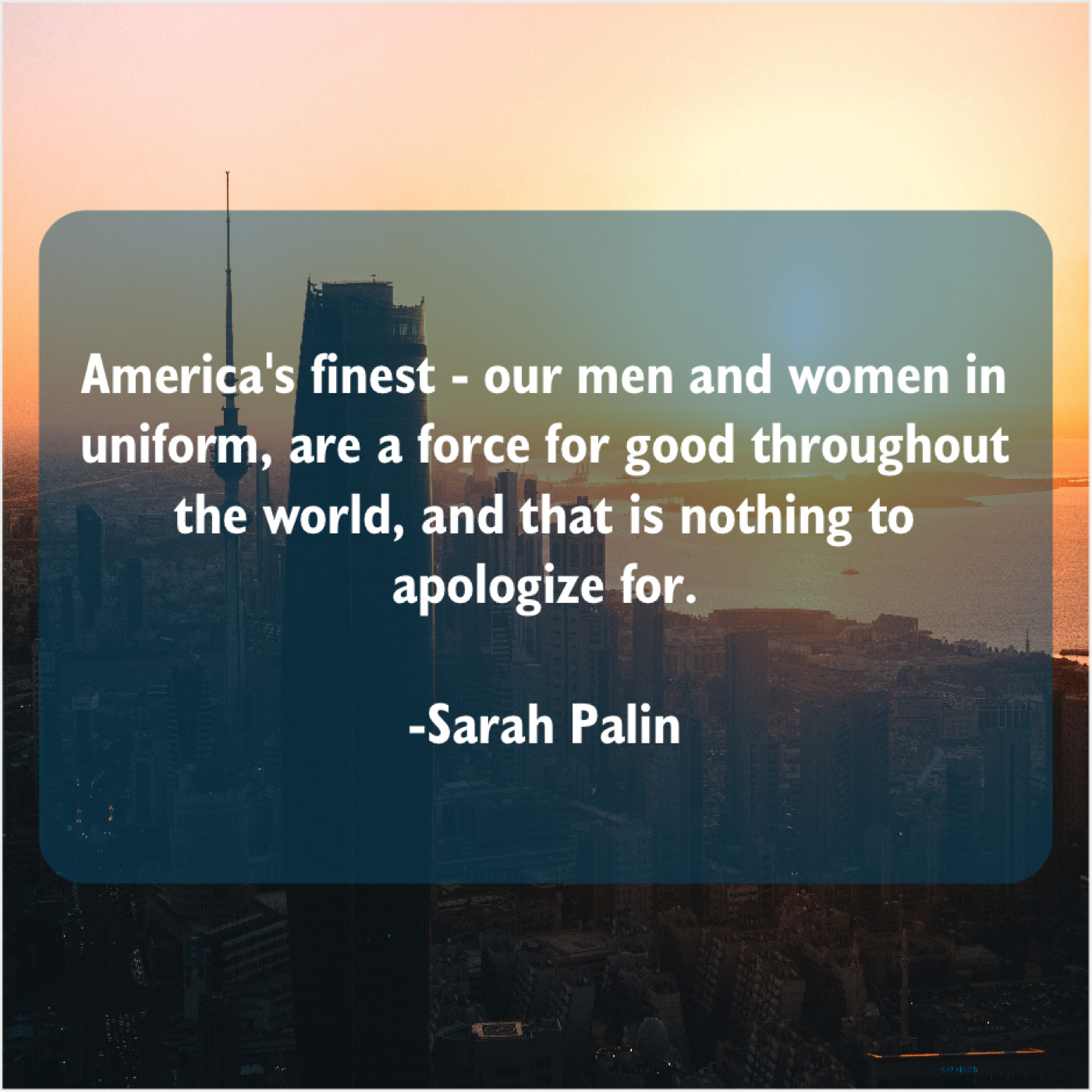 Sarah Palin Sarah Palin – America’s finest – our men and… February 6, 2019 admin “America’s finest – our men and women in uniform, are a force for good throughout the world, and that is nothing to apologize for.”-Sarah Palin