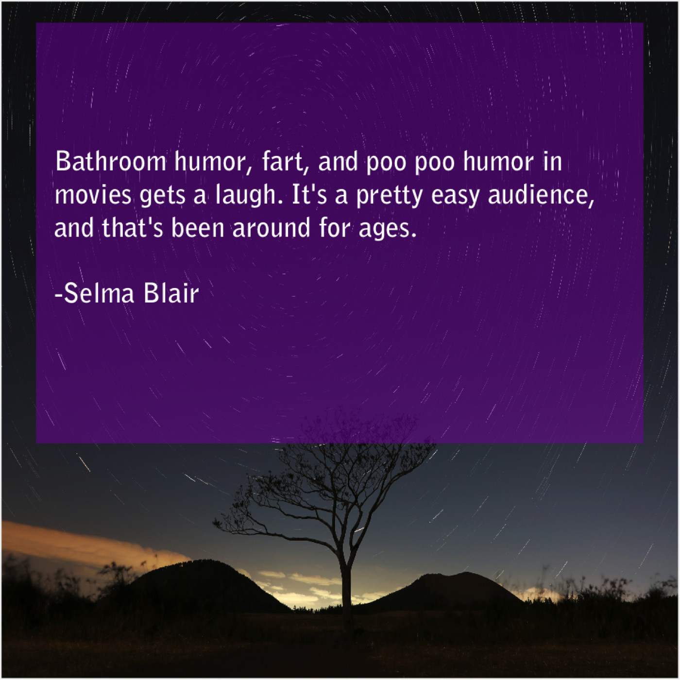 Selma Blair Selma Blair – Bathroom humor, fart, and poo… October 8, 2019 admin “Bathroom humor, fart, and poo poo humor in movies gets a laugh. It’s a pretty easy audience, and that’s been around for ages.”-Selma Blair