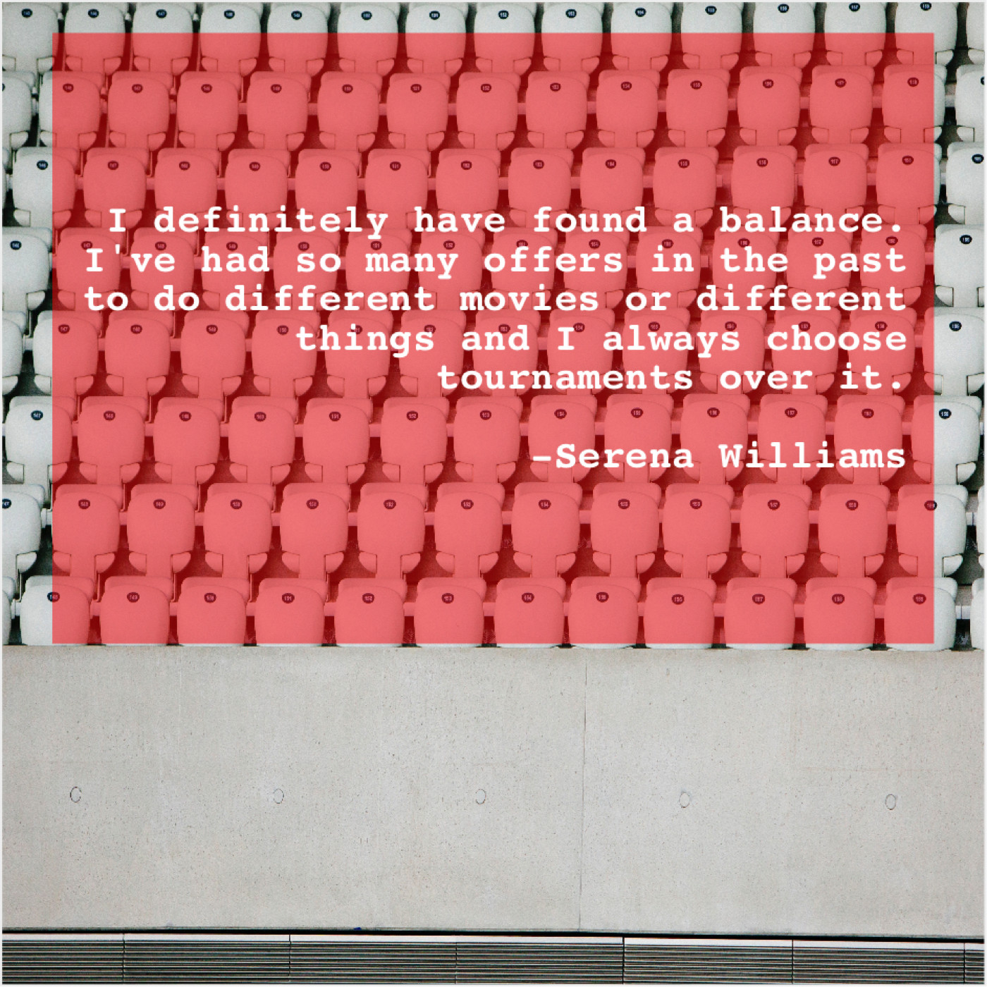 Serena Williams Serena Williams – I definitely have found a… March 20, 2019 admin “I definitely have found a balance. I’ve had so many offers in the past to do different movies or different things and I always choose tournaments over it.”-Serena Williams