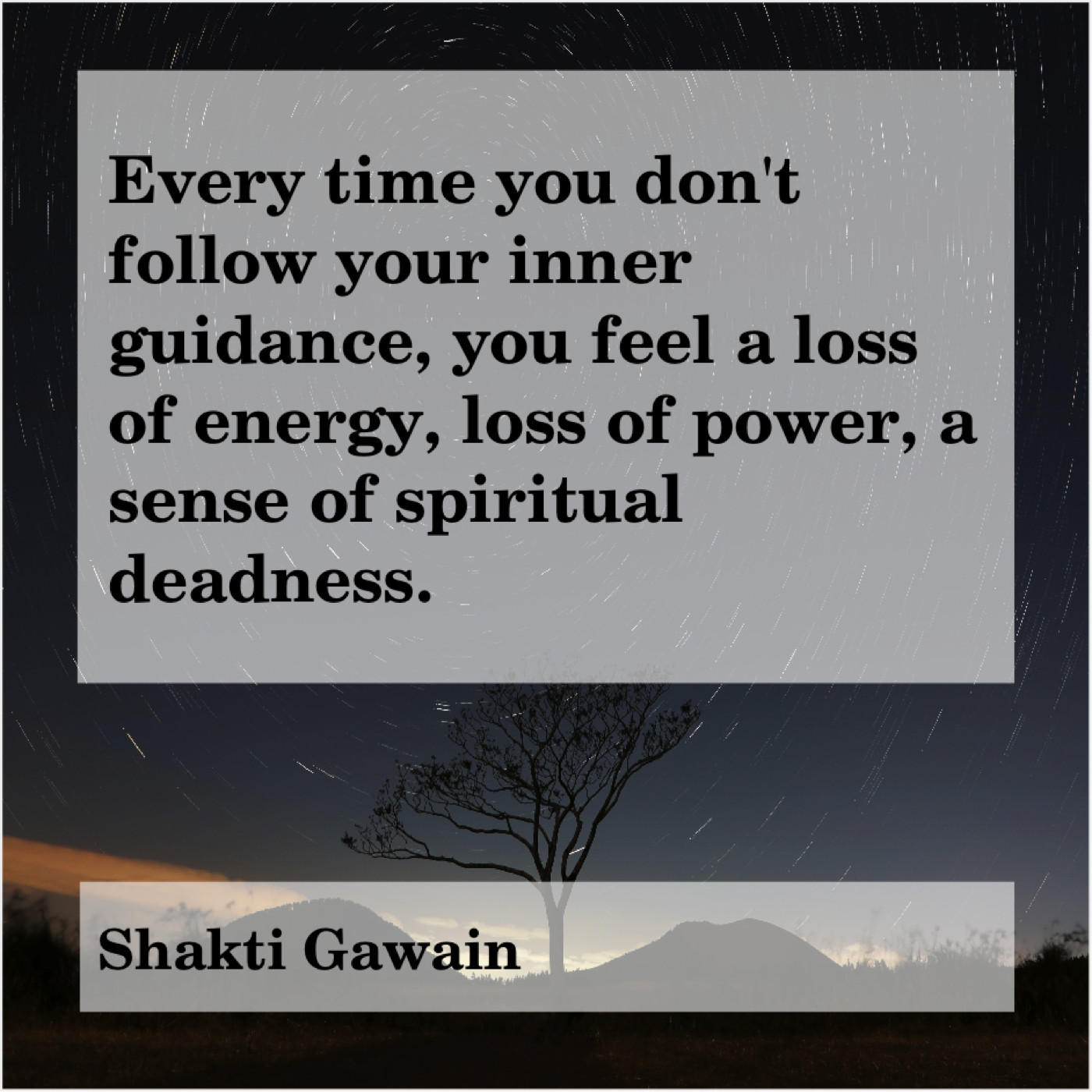 Shakti Gawain Shakti Gawain – Every time you don’t follow… February 11, 2019 admin “Every time you don’t follow your inner guidance, you feel a loss of energy, loss of power, a sense of spiritual deadness.”-Shakti Gawain