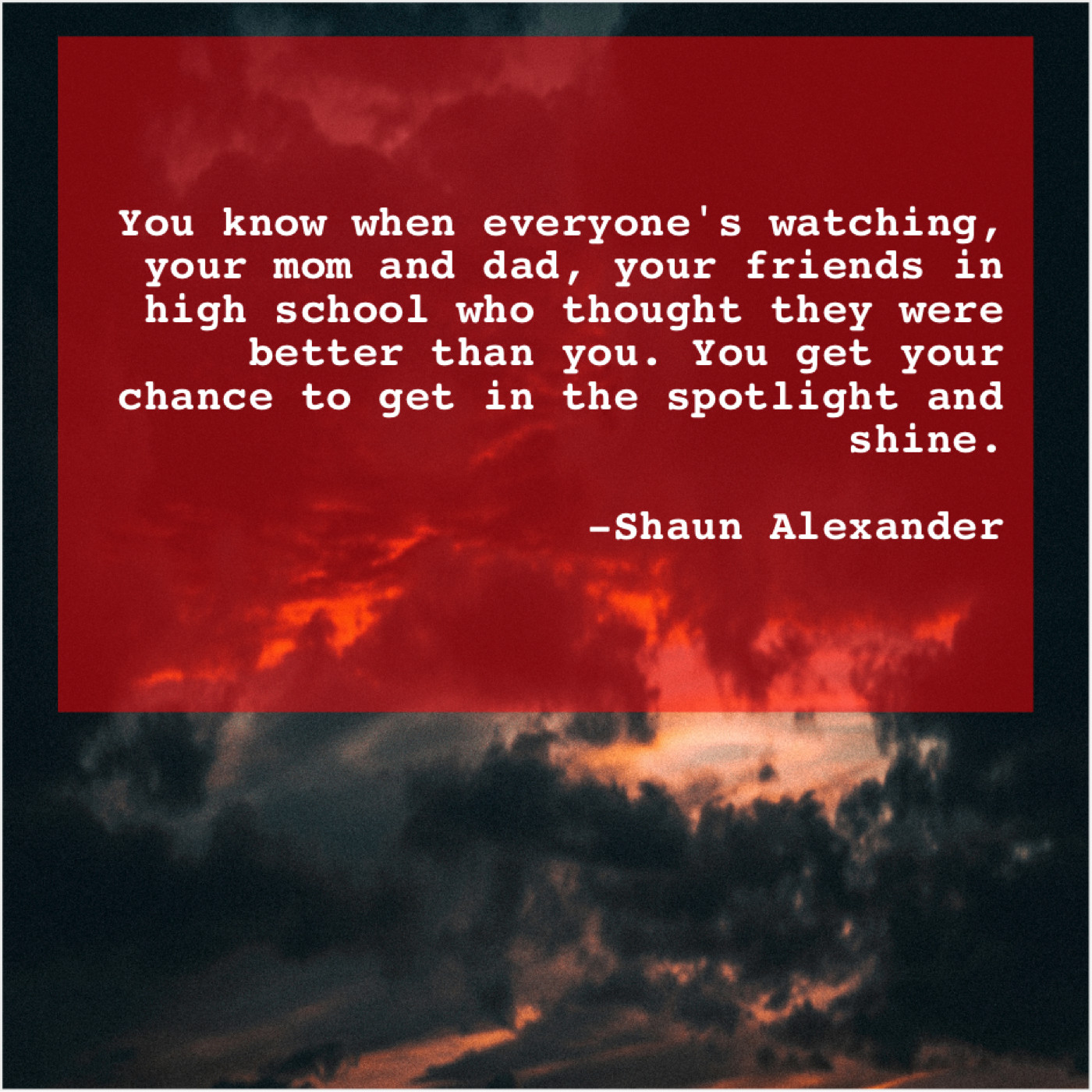 Shaun Alexander Shaun Alexander – You know when everyone’s watching… August 22, 2019 admin “You know when everyone’s watching, your mom and dad, your friends in high school who thought they were better than you. You get your chance to get in the spotlight and shine.”-Shaun Alexander