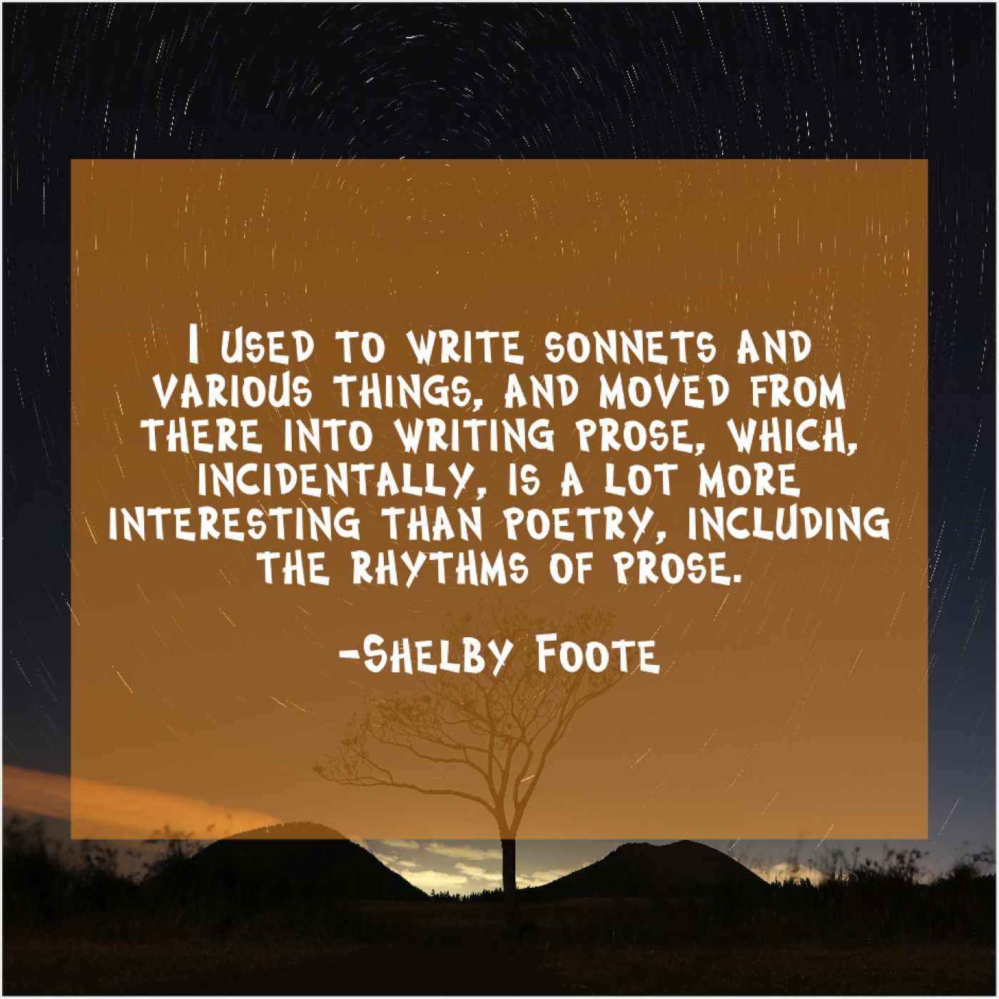 Shelby Foote Shelby Foote – I used to write sonnets… October 5, 2019 admin “I used to write sonnets and various things, and moved from there into writing prose, which, incidentally, is a lot more interesting than poetry, including the rhythms of prose.”-Shelby Foote
