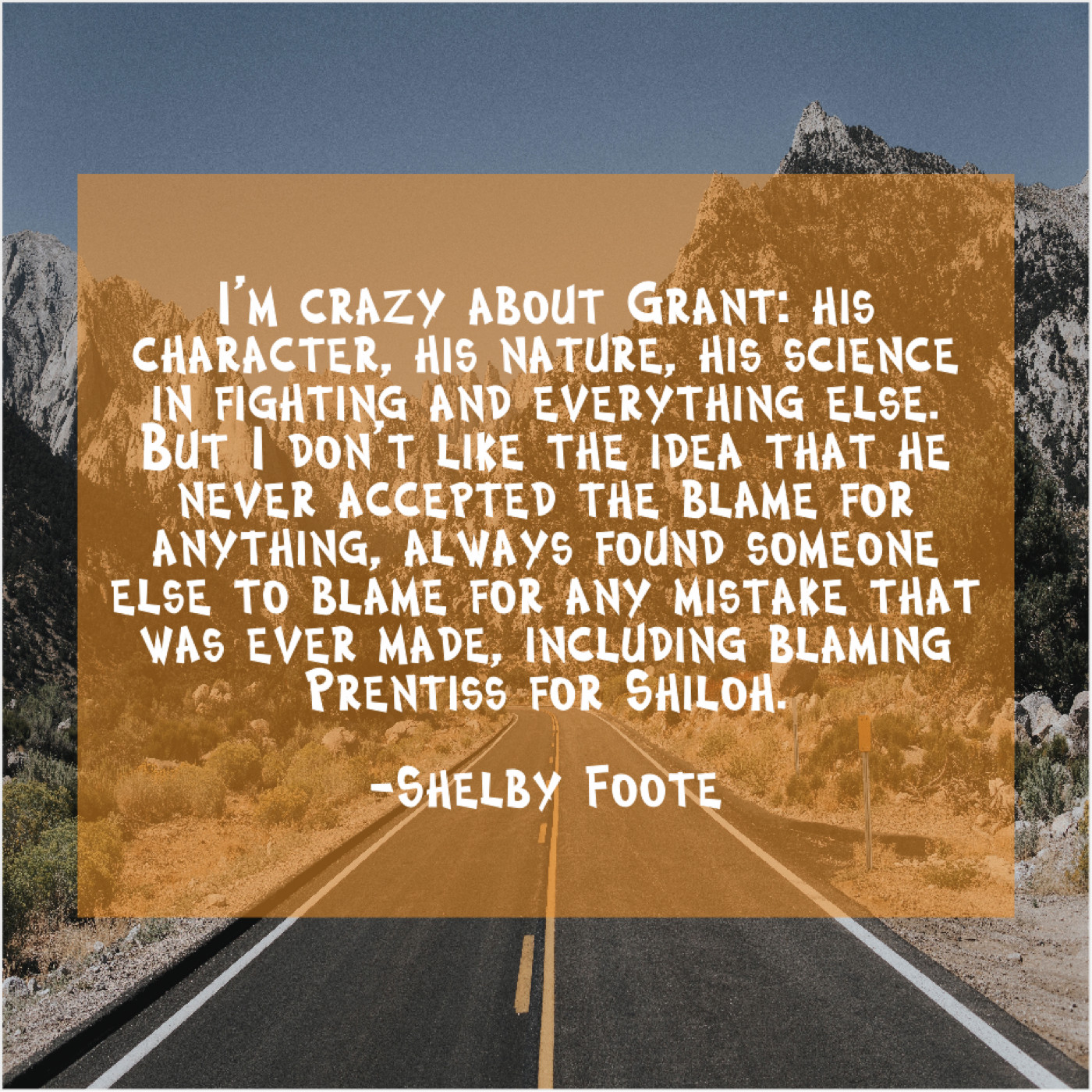 “I’m crazy about Grant: his character, his nature, his science in fighting and everything else. But I don’t like the idea that he never accepted the blame for anything, always found someone else to blame for any mistake that was ever made, including blaming Prentiss for Shiloh.”