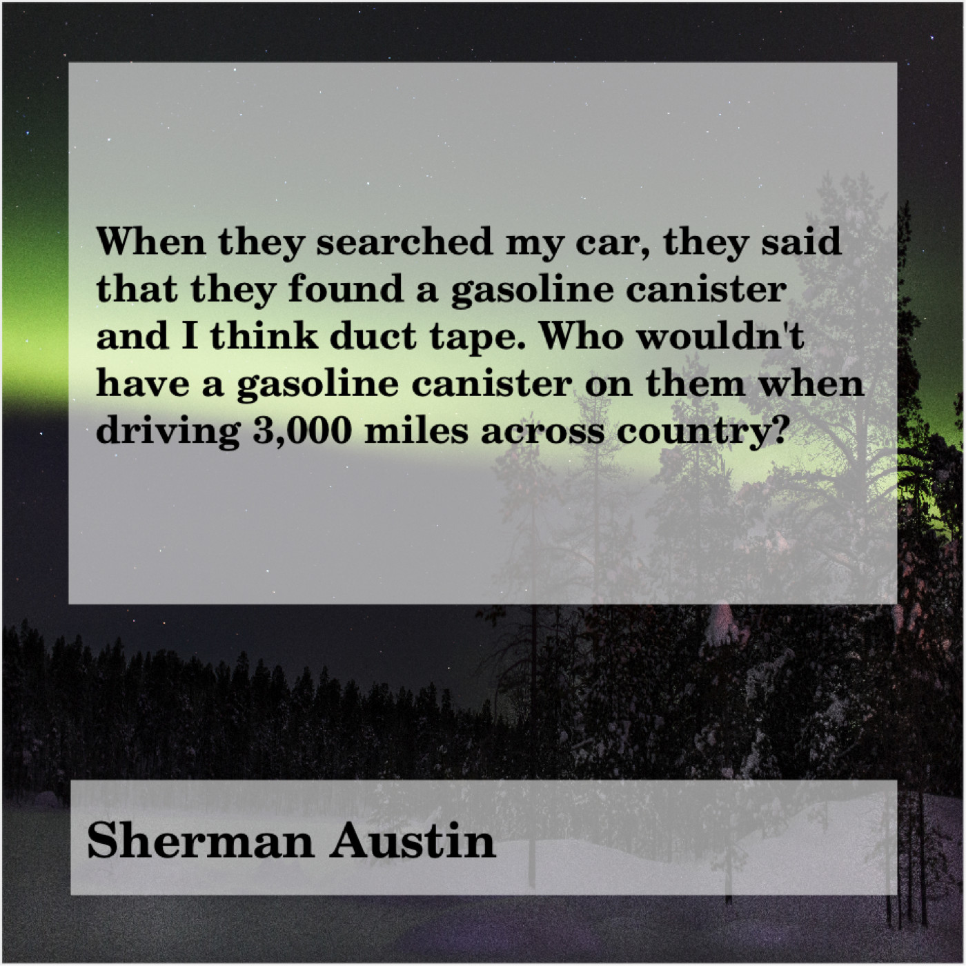 Sherman Austin Sherman Austin – When they searched my car… May 23, 2019 admin “When they searched my car, they said that they found a gasoline canister and I think duct tape. Who wouldn’t have a gasoline canister on them when driving 3,000 miles across country?”-Sherman Austin