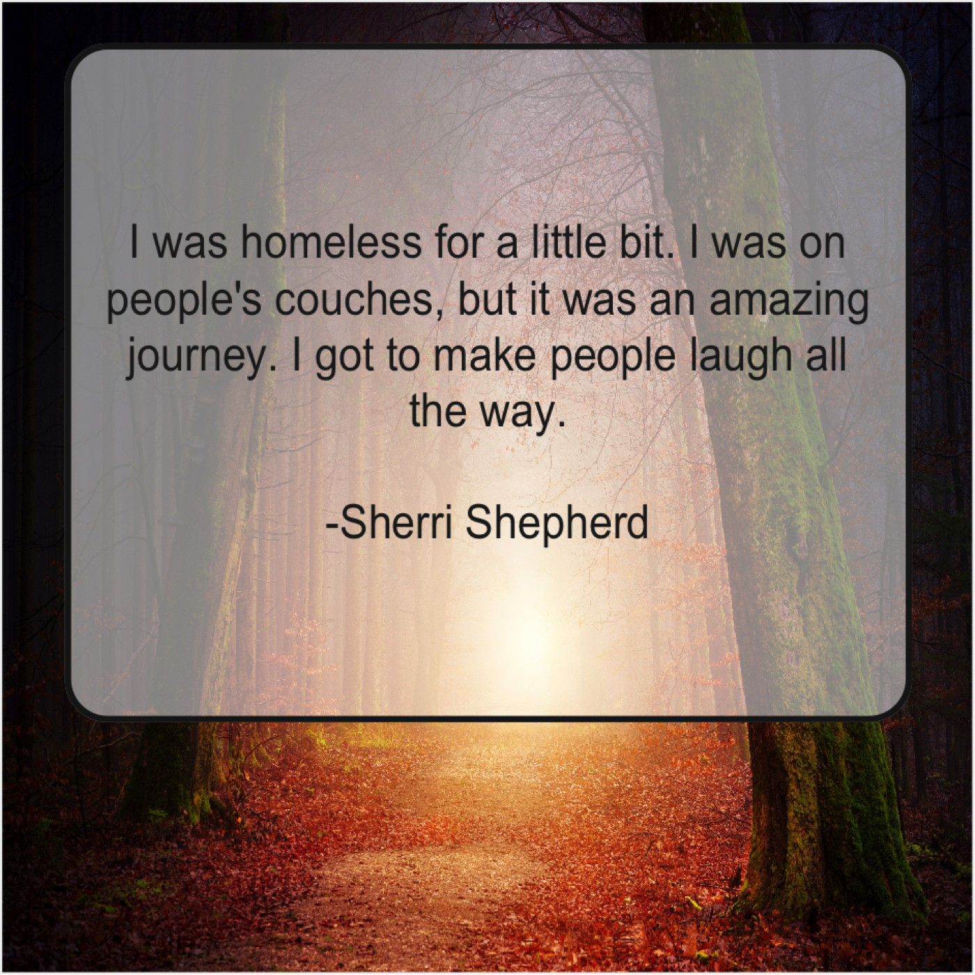 Sherri Shepherd Sherri Shepherd – I was homeless for a… July 23, 2019 admin “I was homeless for a little bit. I was on people’s couches, but it was an amazing journey. I got to make people laugh all the way.”-Sherri Shepherd