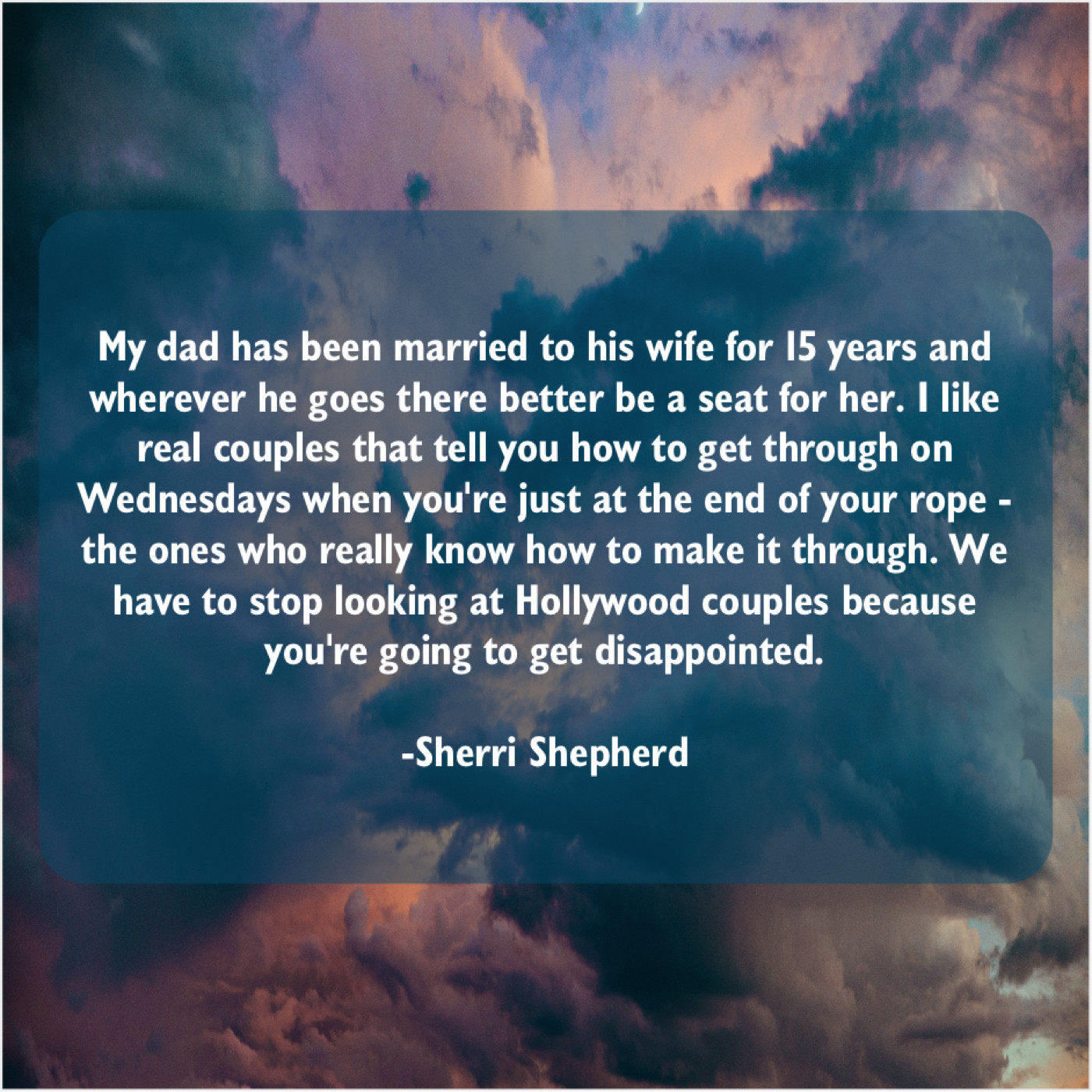 “My dad has been married to his wife for 15 years and wherever he goes there better be a seat for her. I like real couples that tell you how to get through on Wednesdays when you’re just at the end of your rope – the ones who really know how to make it through. We have to stop looking at Hollywood couples because you’re going to get disappointed.”