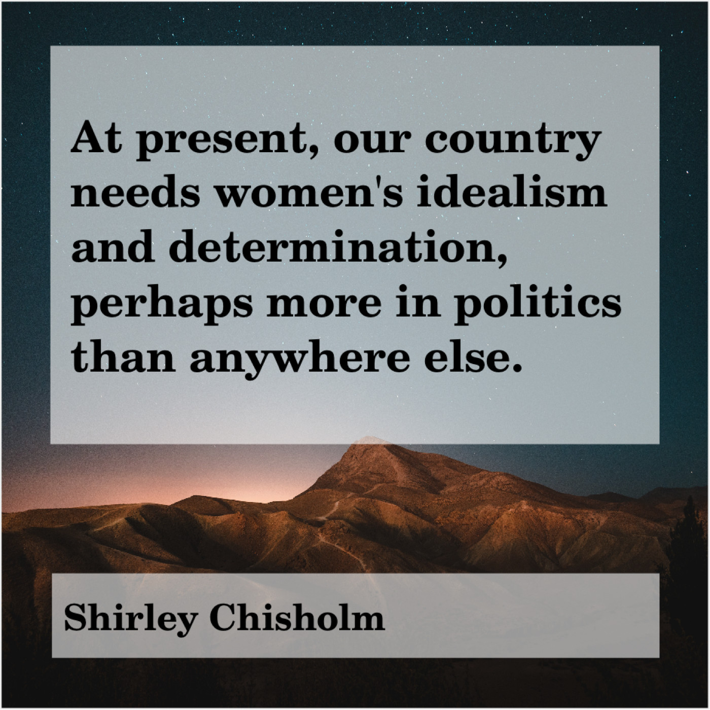 Shirley Chisholm Shirley Chisholm – At present, our country needs… September 30, 2019 admin “At present, our country needs women’s idealism and determination, perhaps more in politics than anywhere else.”-Shirley Chisholm