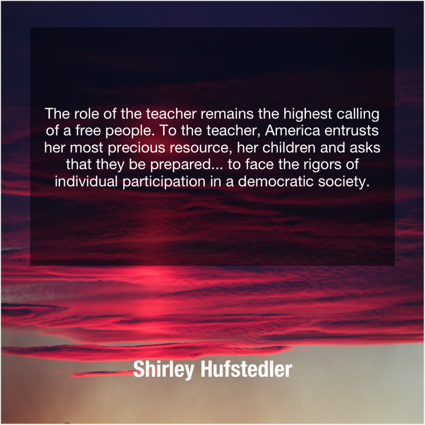 “The role of the teacher remains the highest calling of a free people. To the teacher, America entrusts her most precious resource, her children and asks that they be prepared… to face the rigors of individual participation in a democratic society.”