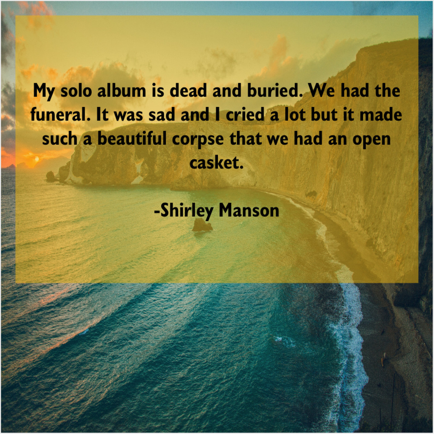Shirley Manson Shirley Manson – My solo album is dead… July 3, 2019 admin “My solo album is dead and buried. We had the funeral. It was sad and I cried a lot but it made such a beautiful corpse that we had an open casket.”-Shirley Manson