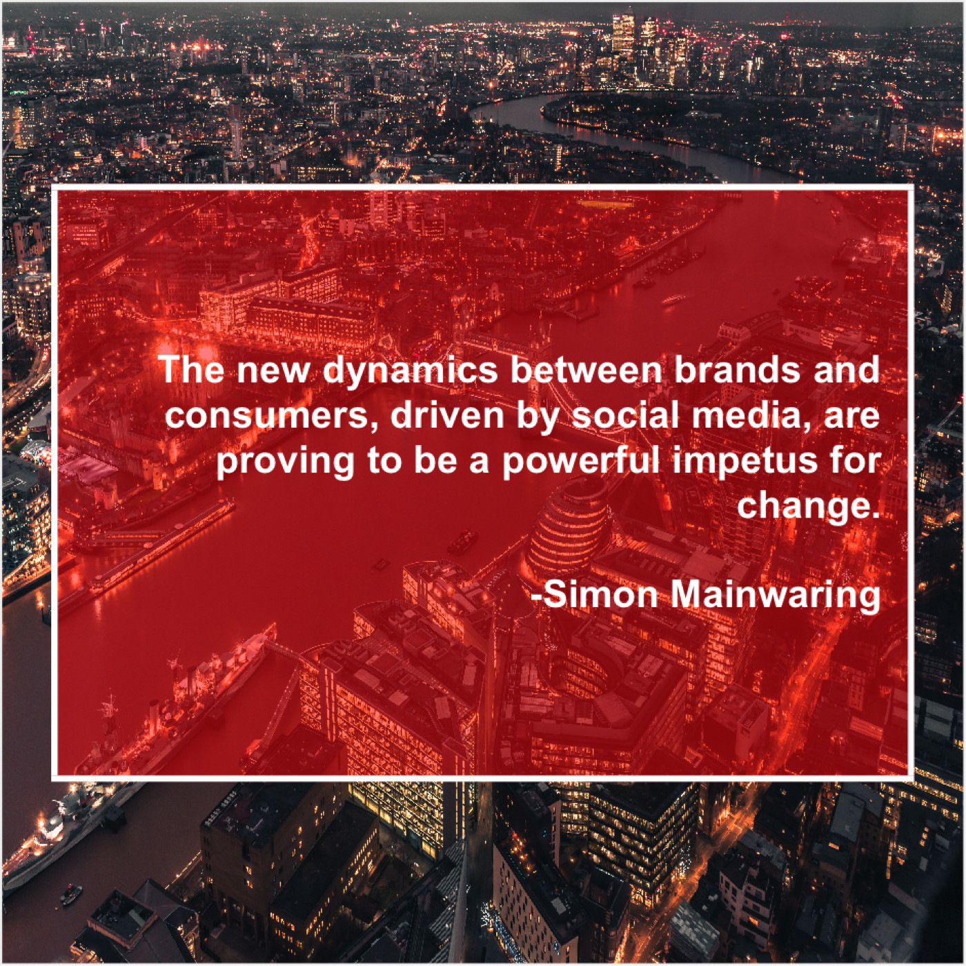 Simon Mainwaring Simon Mainwaring – The new dynamics between brands… June 11, 2019 admin “The new dynamics between brands and consumers, driven by social media, are proving to be a powerful impetus for change.”-Simon Mainwaring