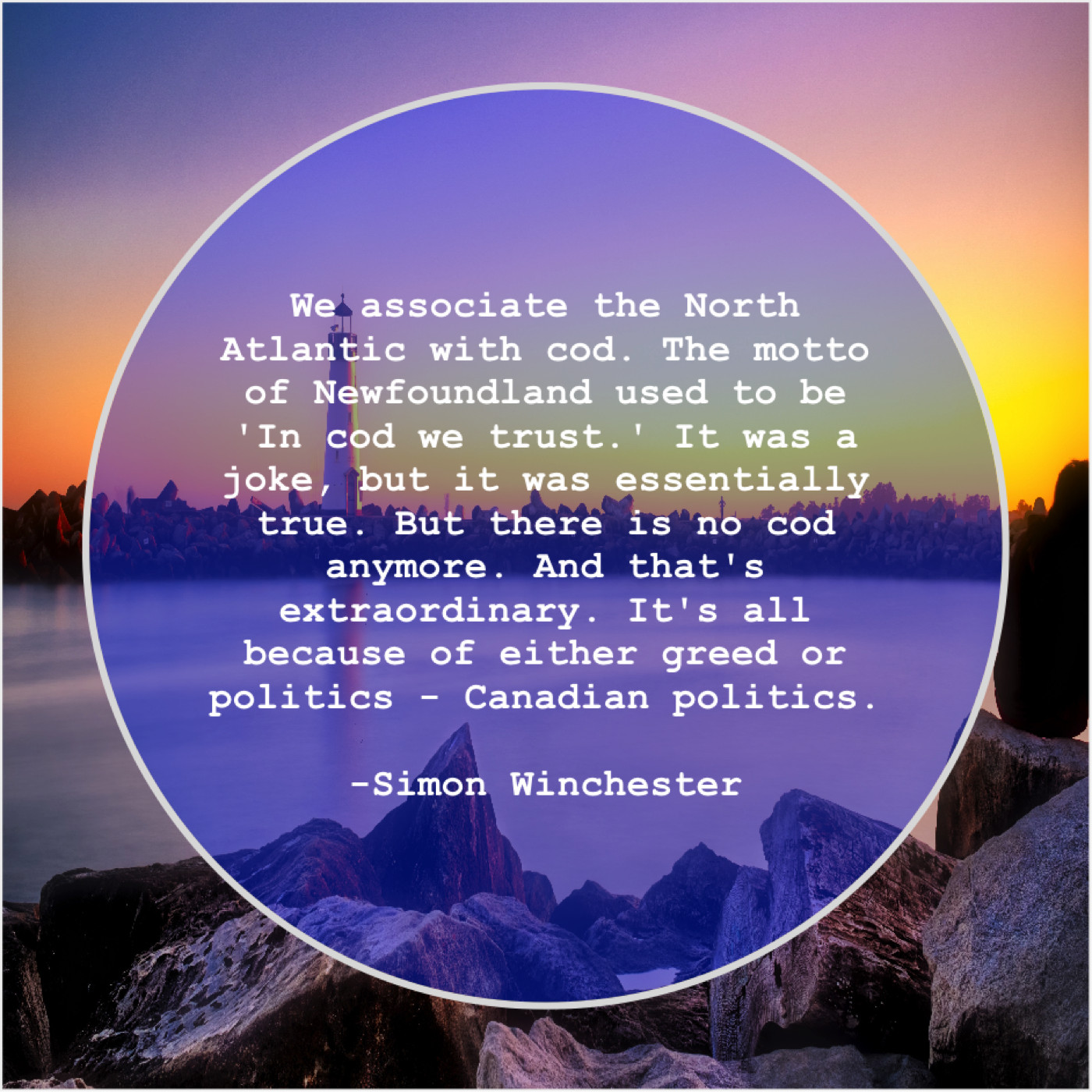 “We associate the North Atlantic with cod. The motto of Newfoundland used to be ‘In cod we trust.’ It was a joke, but it was essentially true. But there is no cod anymore. And that’s extraordinary. It’s all because of either greed or politics – Canadian politics.”