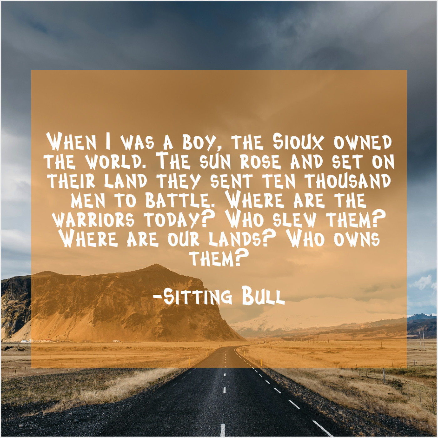 Sitting Bull Sitting Bull – When I was a boy… April 28, 2019 admin “When I was a boy, the Sioux owned the world. The sun rose and set on their land they sent ten thousand men to battle. Where are the warriors today? Who slew them? Where are our lands? Who owns them?”-Sitting Bull