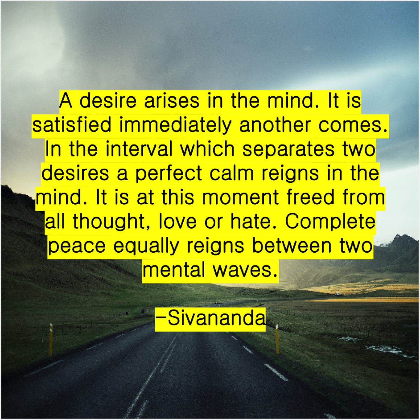 “A desire arises in the mind. It is satisfied immediately another comes. In the interval which separates two desires a perfect calm reigns in the mind. It is at this moment freed from all thought, love or hate. Complete peace equally reigns between two mental waves.”
