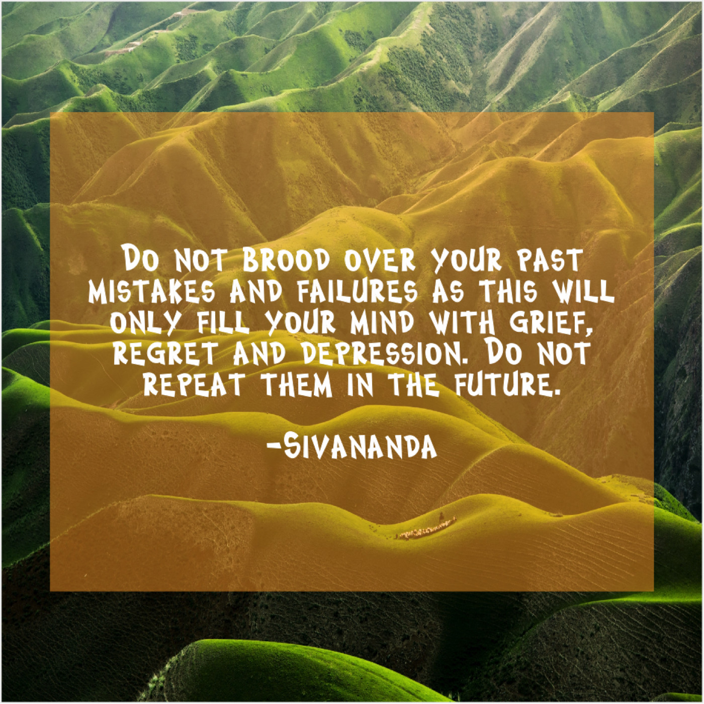 Sivananda Sivananda – Do not brood over your… November 15, 2018 admin “Do not brood over your past mistakes and failures as this will only fill your mind with grief, regret and depression. Do not repeat them in the future.”-Sivananda